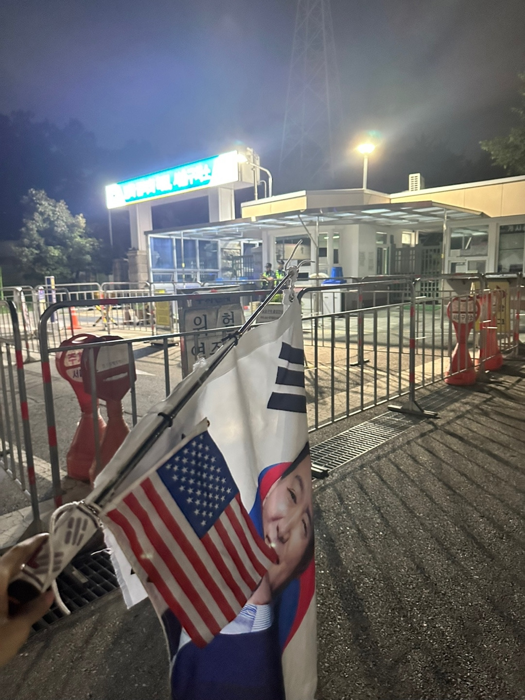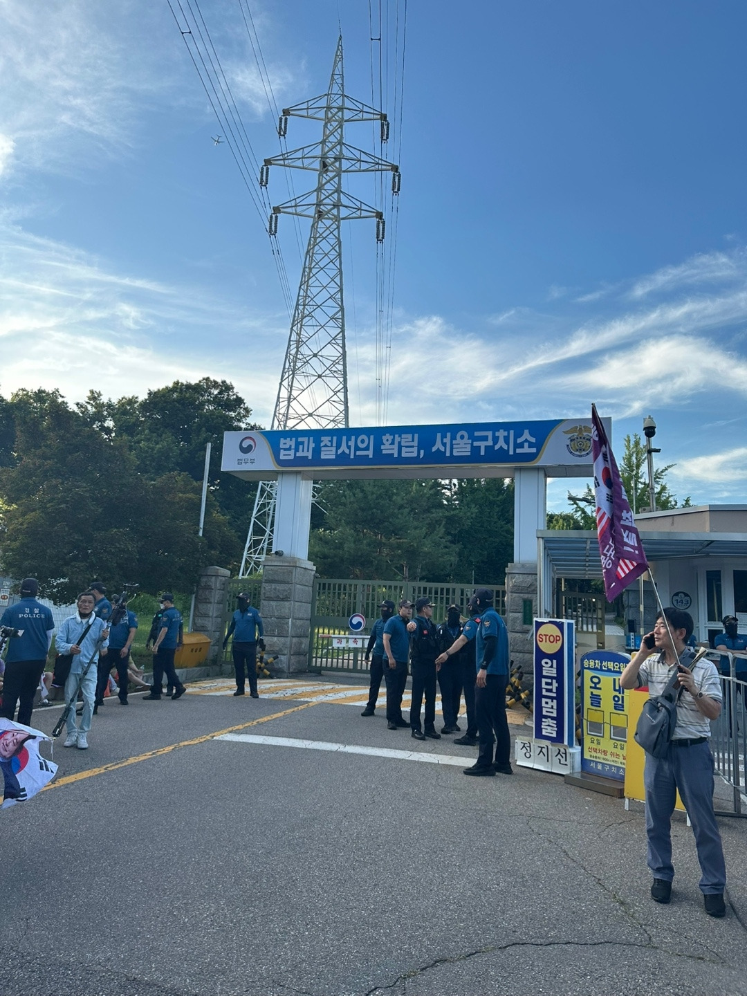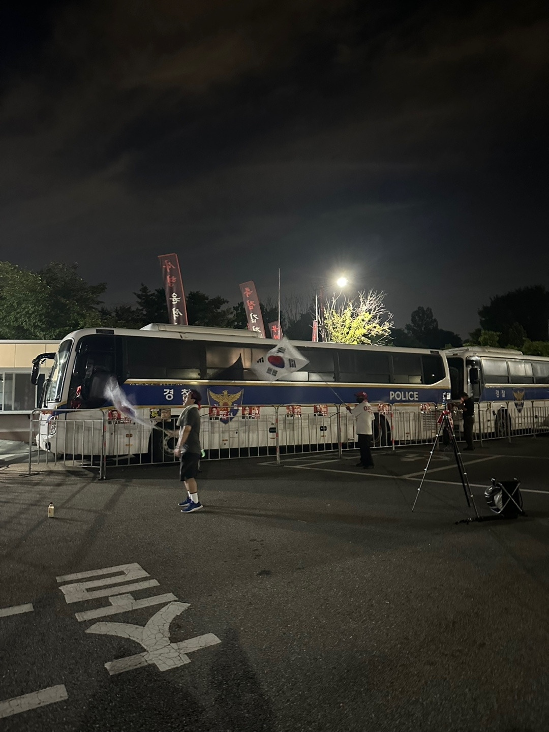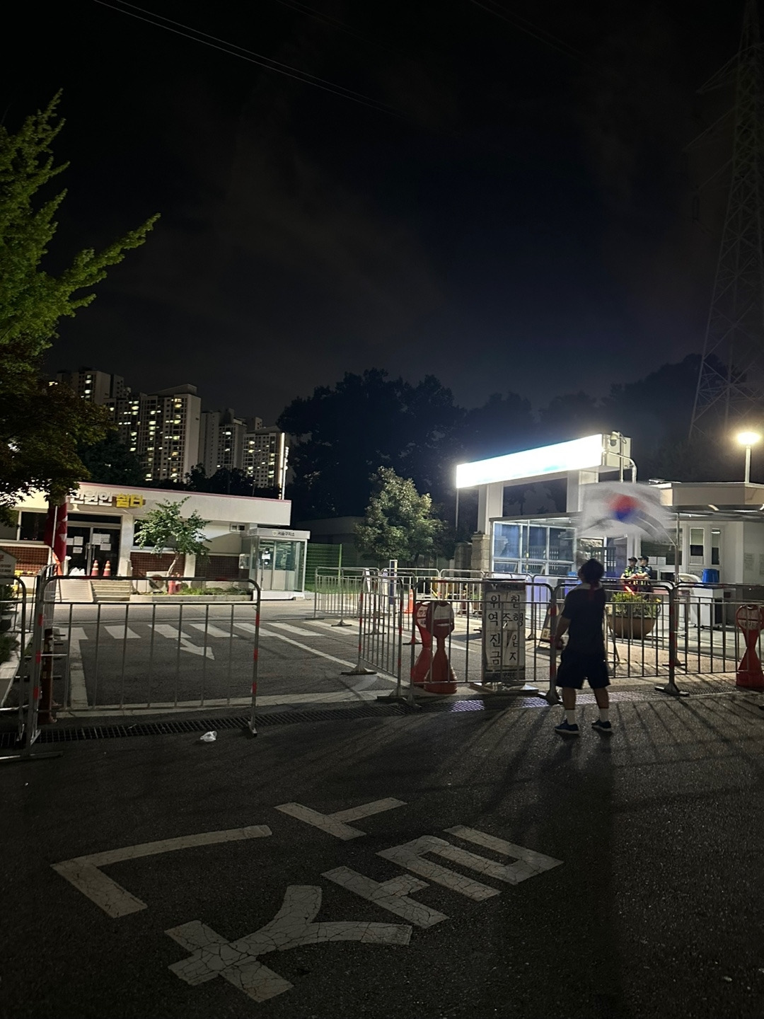 구치소 입구를 지나치려고 하는데 청년들이 태극기를 흔들며 다시 구호를 외친다. 차마 발길이 떨어지지 않는다. 그래 이왕 늦은 거 더 있다 가자. 나는 가방을 내려놓고 콘이를 잠시 묶어놓고 힘차게 태극기를 크게 흔든다. 좌우로 더 크게 젓는다. 나의 기운이, 우리의 기운이 제발 윤 대통령님께 닿기를. 우리의 기운을 다 느끼고 계시겠지. 파란 구치소 간판 불빛이 유난히 밝아 보인다.