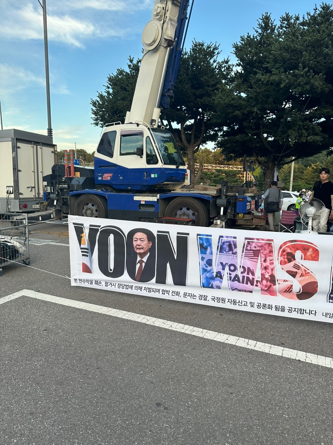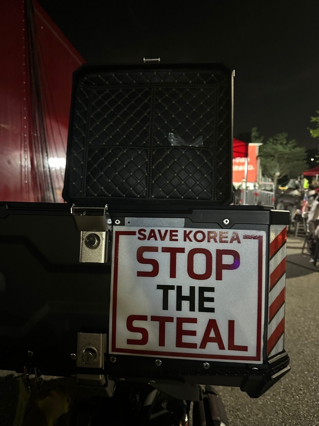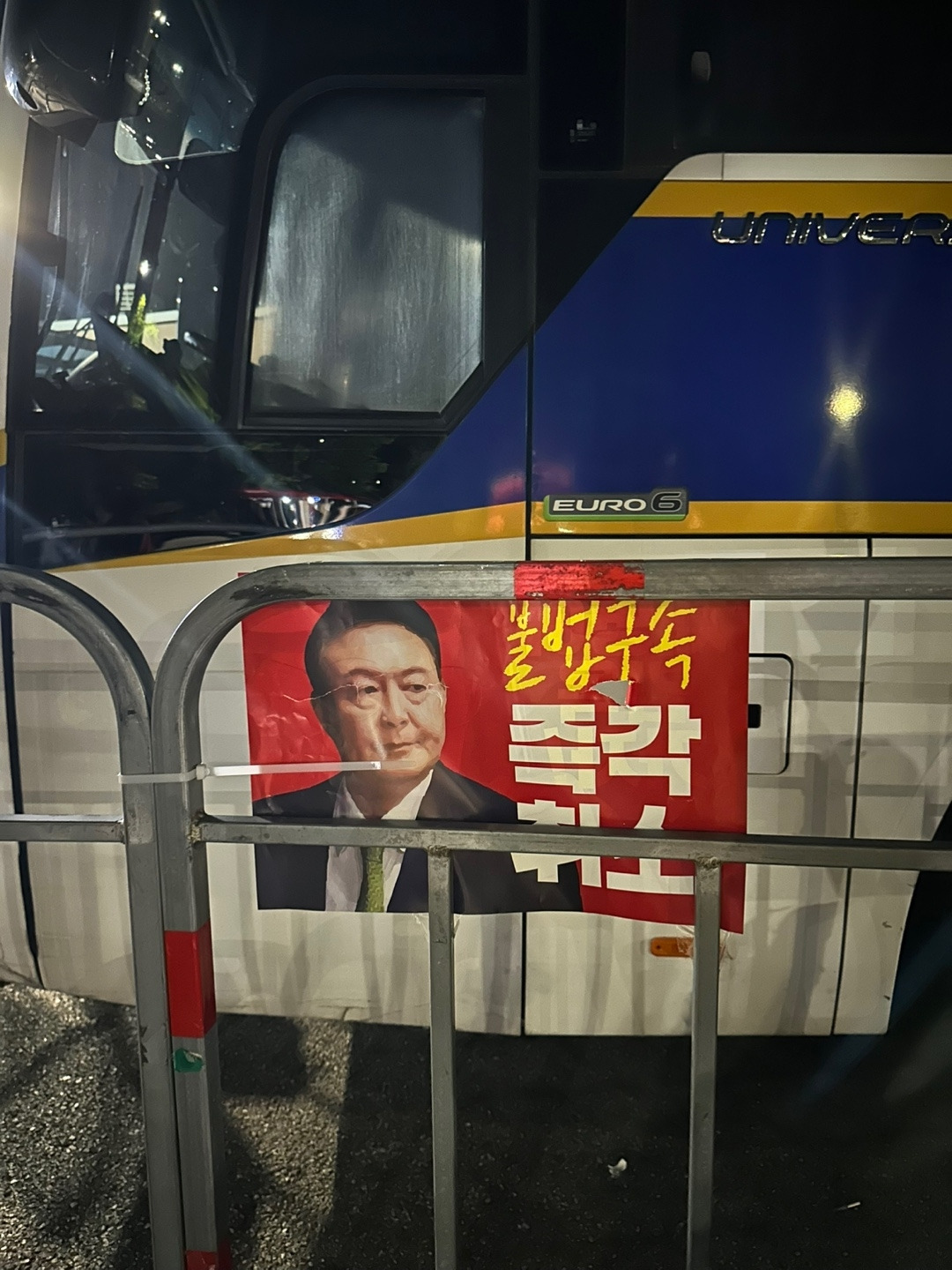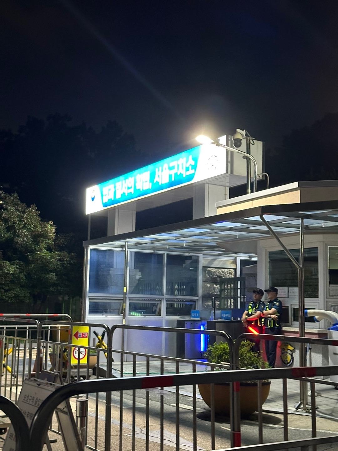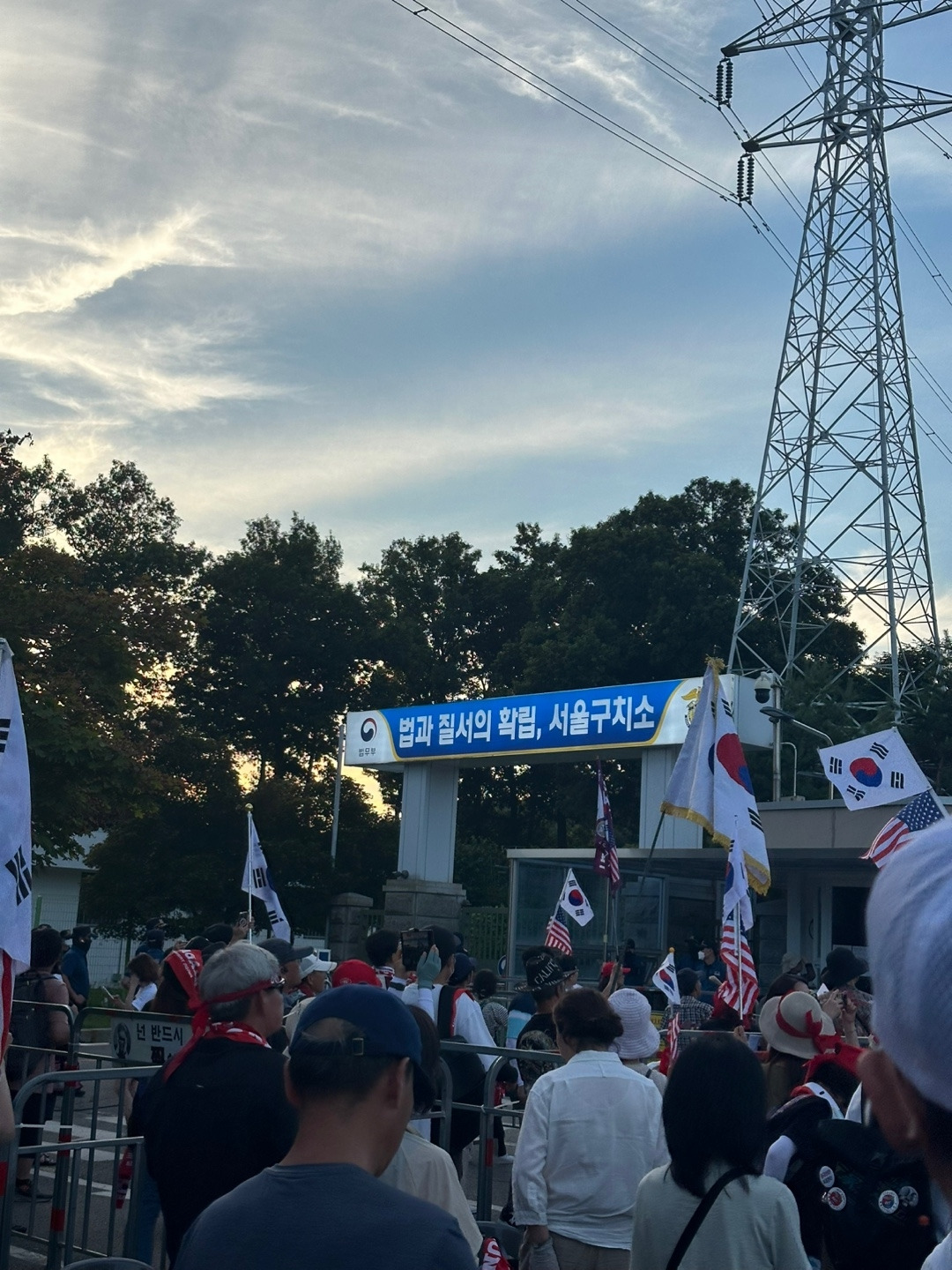 구치소 입구를 지나치려고 하는데 청년들이 태극기를 흔들며 다시 구호를 외친다. 차마 발길이 떨어지지 않는다. 그래 이왕 늦은 거 더 있다 가자. 나는 가방을 내려놓고 콘이를 잠시 묶어놓고 힘차게 태극기를 크게 흔든다. 좌우로 더 크게 젓는다. 나의 기운이, 우리의 기운이 제발 윤 대통령님께 닿기를. 우리의 기운을 다 느끼고 계시겠지. 파란 구치소 간판 불빛이 유난히 밝아 보인다.