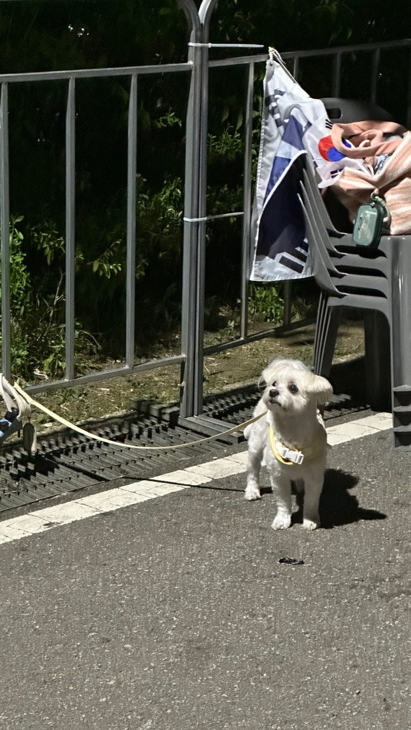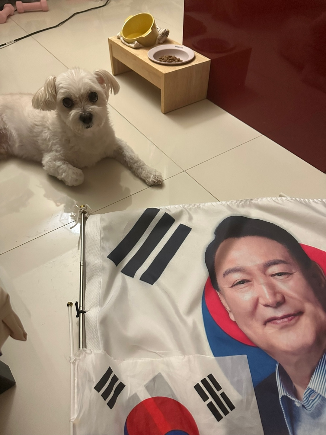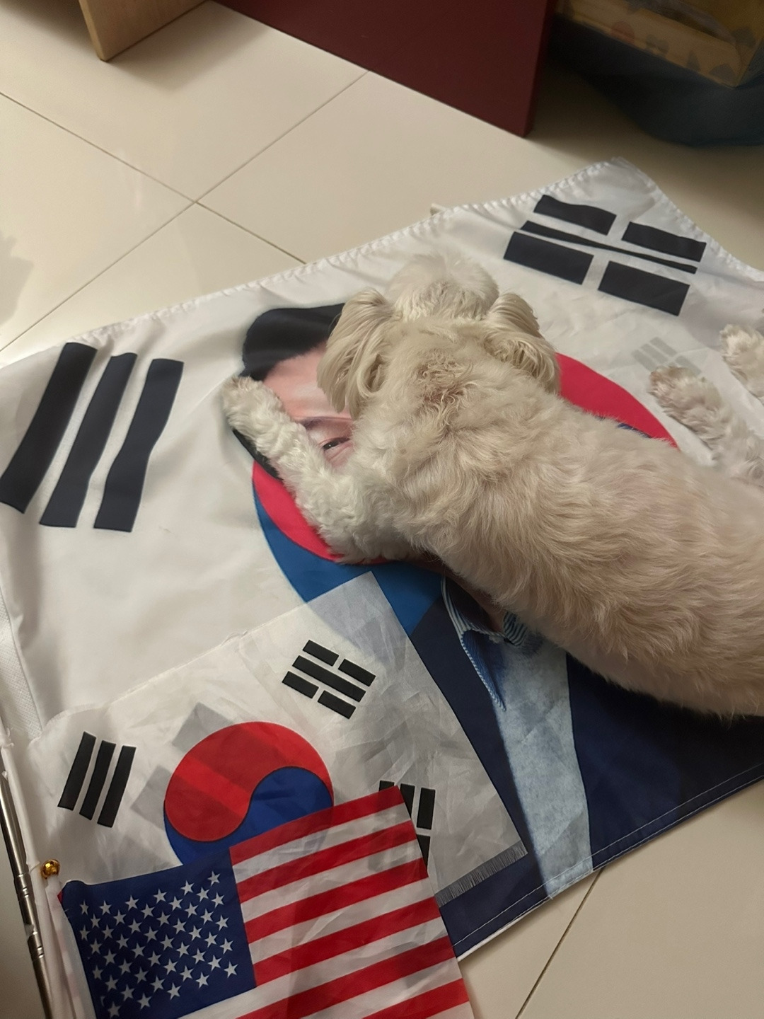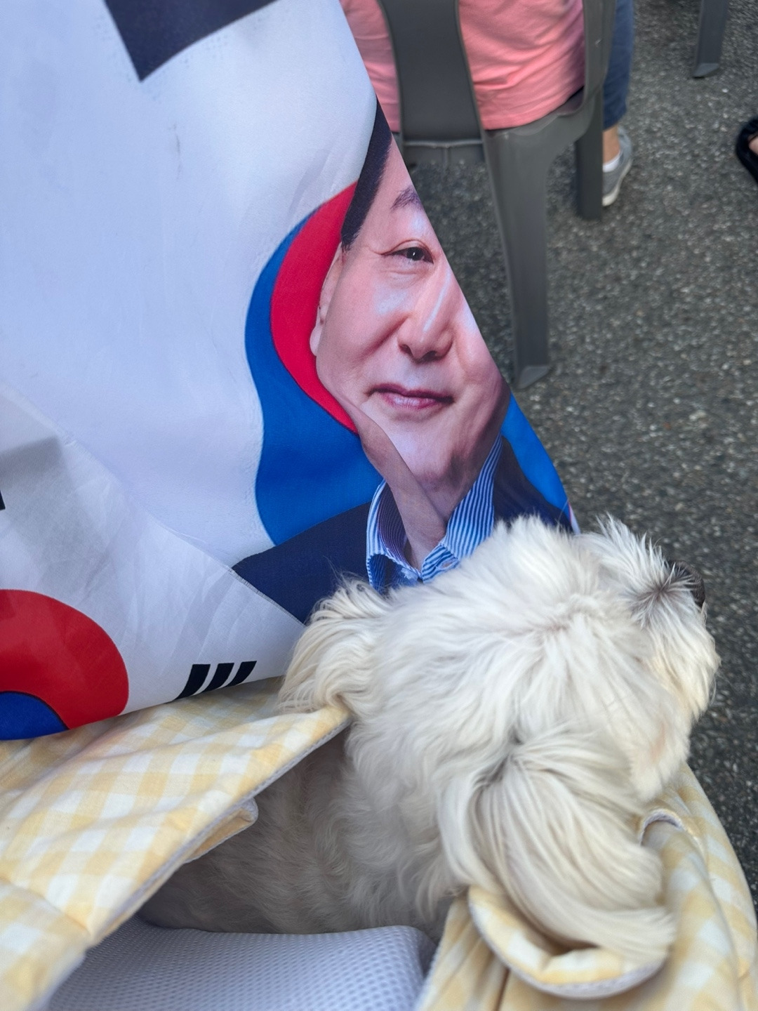 이제 팝콘이도 지쳤는지 헤헥 거리며 두 발로 점프를 한다. 말없이 태극기를 흔들며 구호를 외치는 내 모습을 바라보다 바닥에 있는 내 가방 위에 털썩 눕는다. 팝콘아 너도 힘들지. 엄마 따라 애국활동하느라 너도 고생이 많다. 이제 집에 가자.