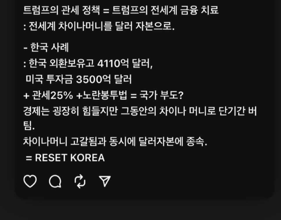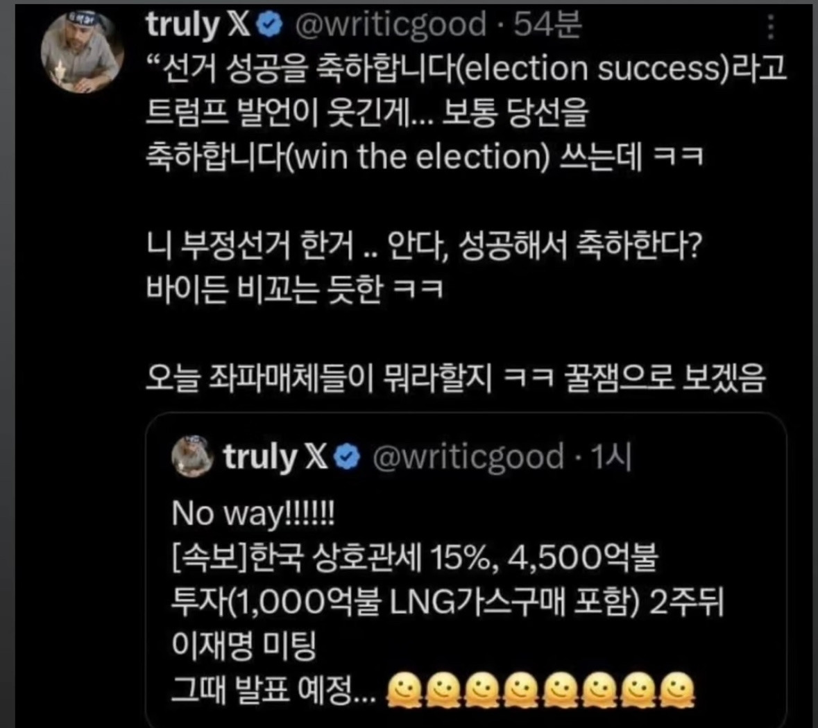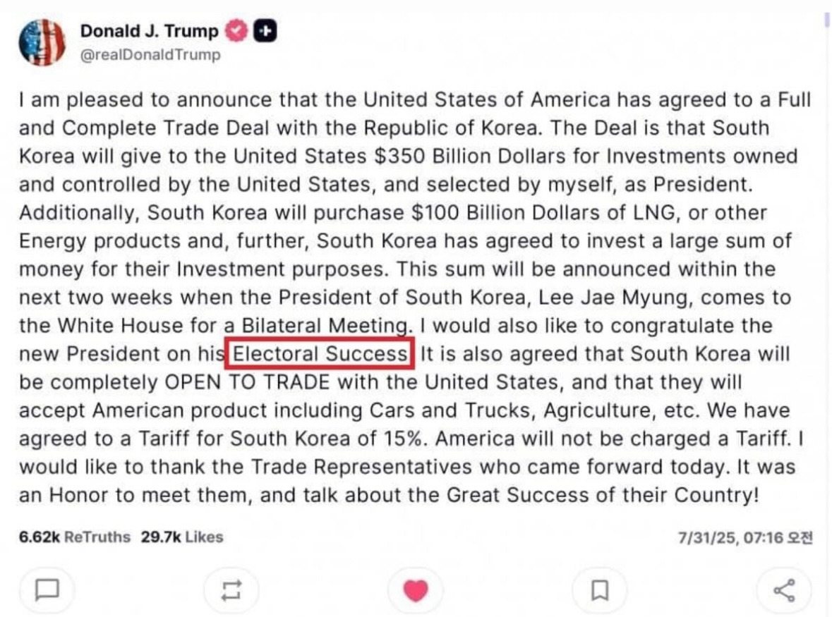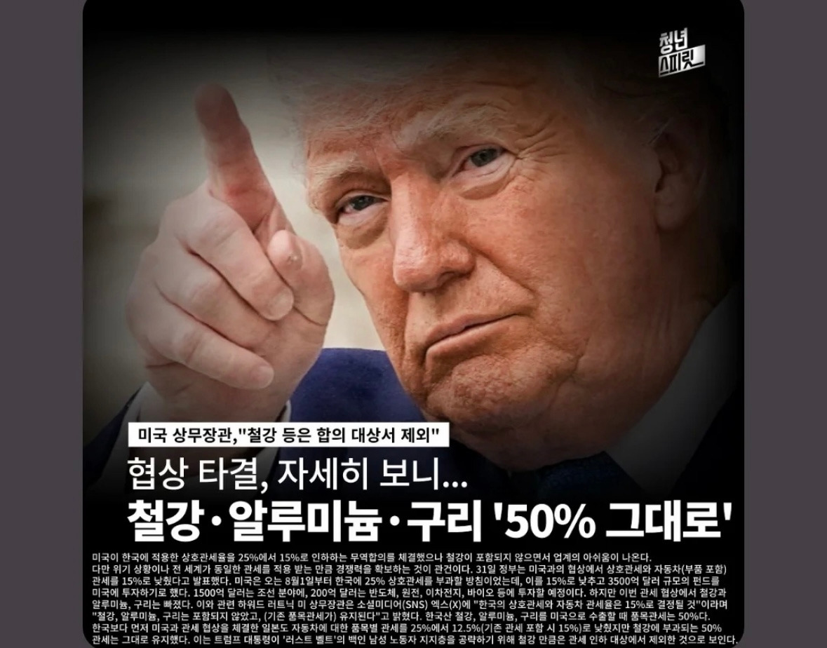 10. 여러분, 상호관세 아니고요. 일방관세에요. 트럼프가 글쓴거 하단에 자료 있습니다. 철강, 알루미늄은 그대로 50% 입니다. 차라리 이재용씨가 대통령 하세요. 이재명은 무능합니다.