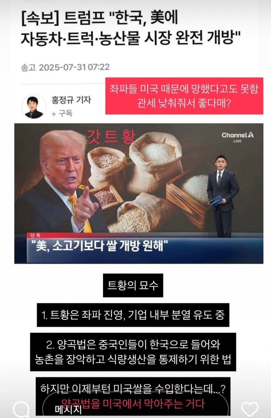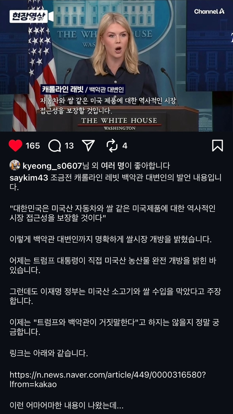 3. 조금 전. 캐롤라인 레빗 백악관 대변인의 발언 내용입니다. "대한민국은 미국산 자동차와 쌀 같은 미국제품에 대한 역사적인 시장 접근성을 보장할 것이다" 이렇게 백악관 대변인까지 명확하게 쌀시장 개방을 밝혔습니다. 어제는 트럼프 대통령이 직접 미국산 농산물 완전 개방을 밝힌 바 있습니다. 그런데도 이재명 정부는 미국산 소고기와 쌀 수입을 막았다고 주장합니다.