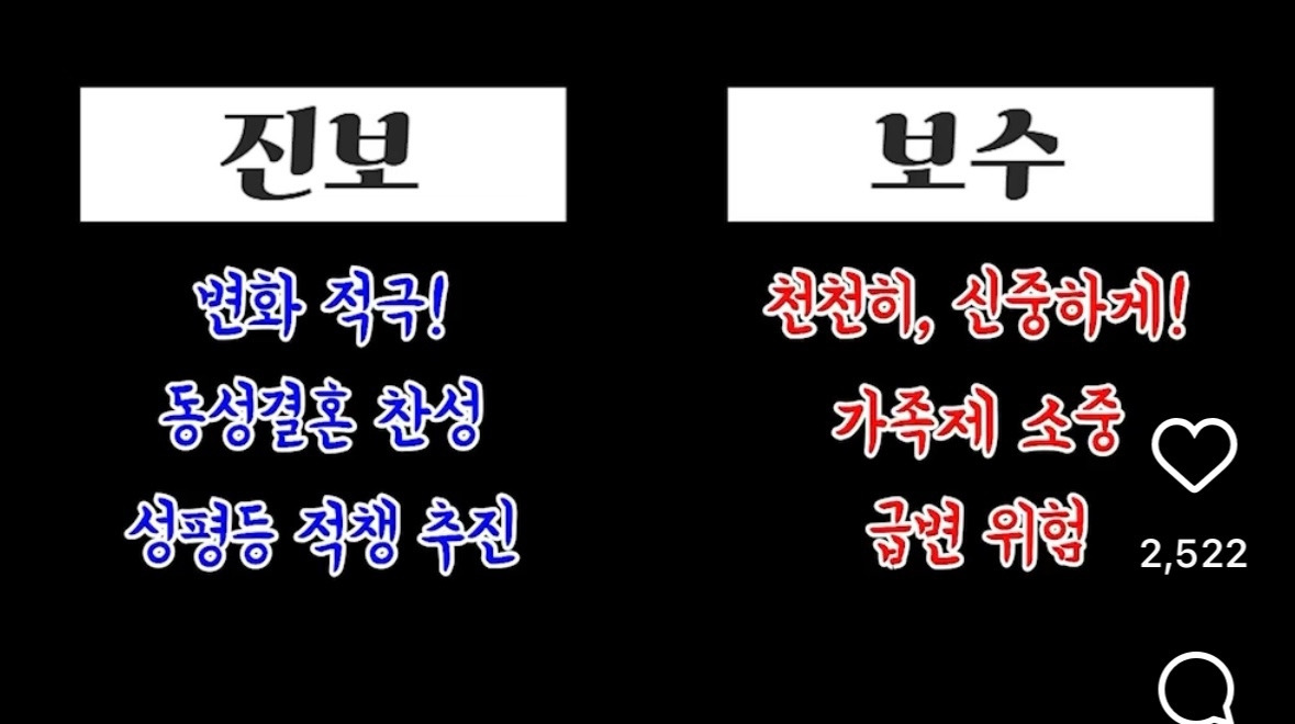 우파-자유민주주의, 친미, 친일. 반중, 반북. 주적은 북한이라고 말함. 멸공을 외친다.