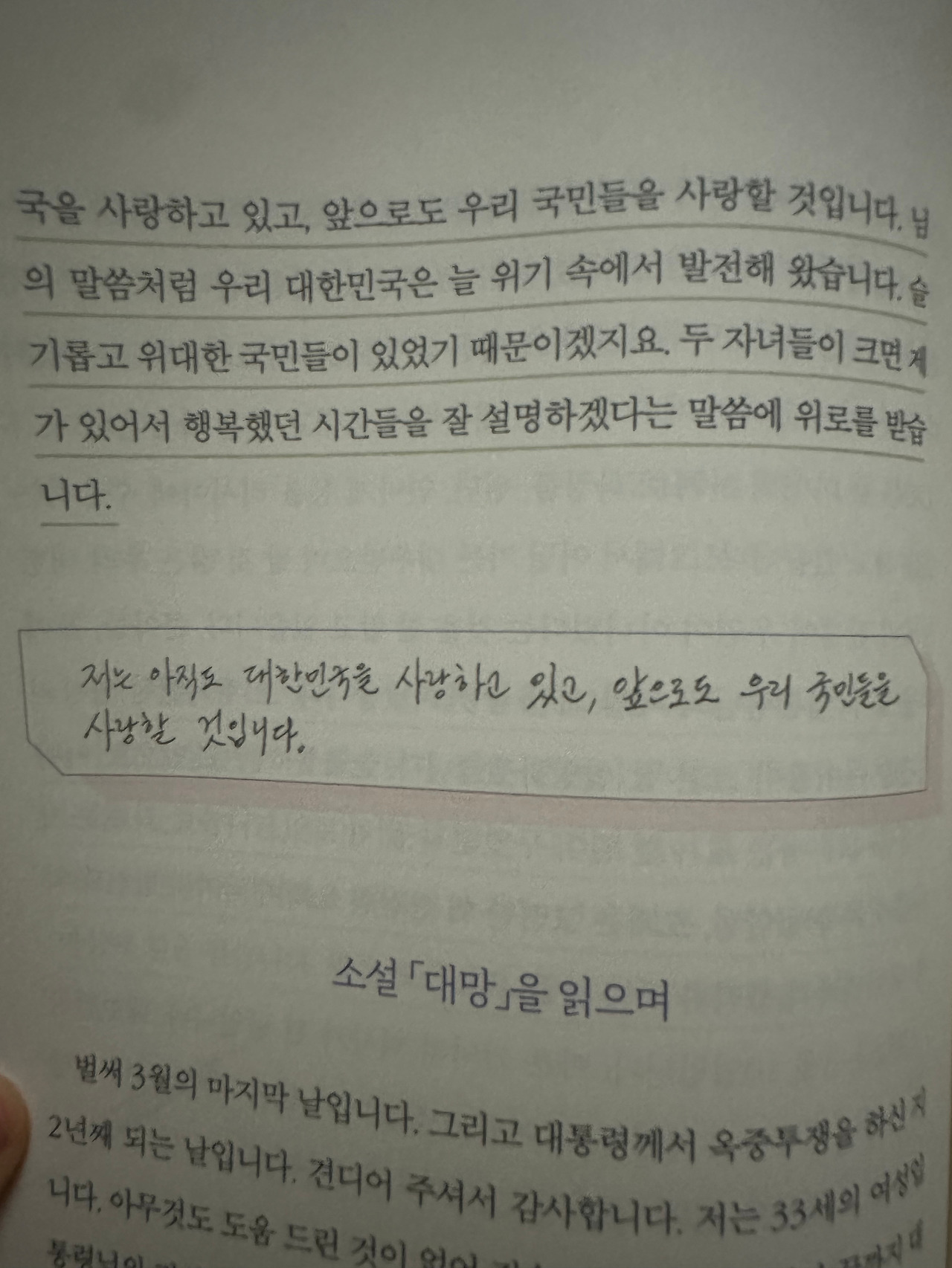 저는 아직도 대한민국을 사랑하고 있고, 앞으로도 우리 국민들을 사랑할 것입니다.