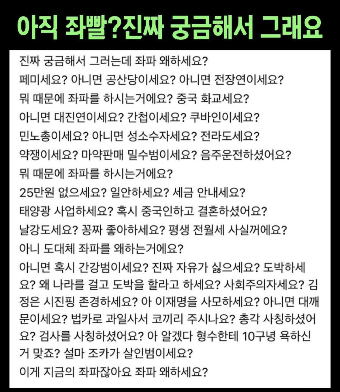 멸공을 외쳤다는 이유로 장채환 선수와 현직 경찰이 현재 징계 위기에 겪고있다. 그리고 태극기 집회를 나가면 경찰들이 집회를 방해하는 상황들을 많이 보았다. 그리고 간혹 내가 쓴 SNS 부정선거 글에 극우꼴통, 꿈깨거라, 정신차려라 등의 악플이 종종 달리기도 한다. 나는 그저 대한민국을 사랑하는, 힘없고 평범한 애국청년일 뿐이다.