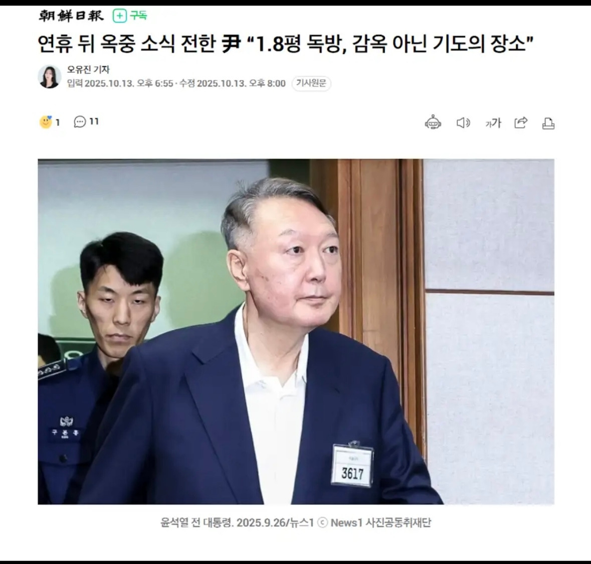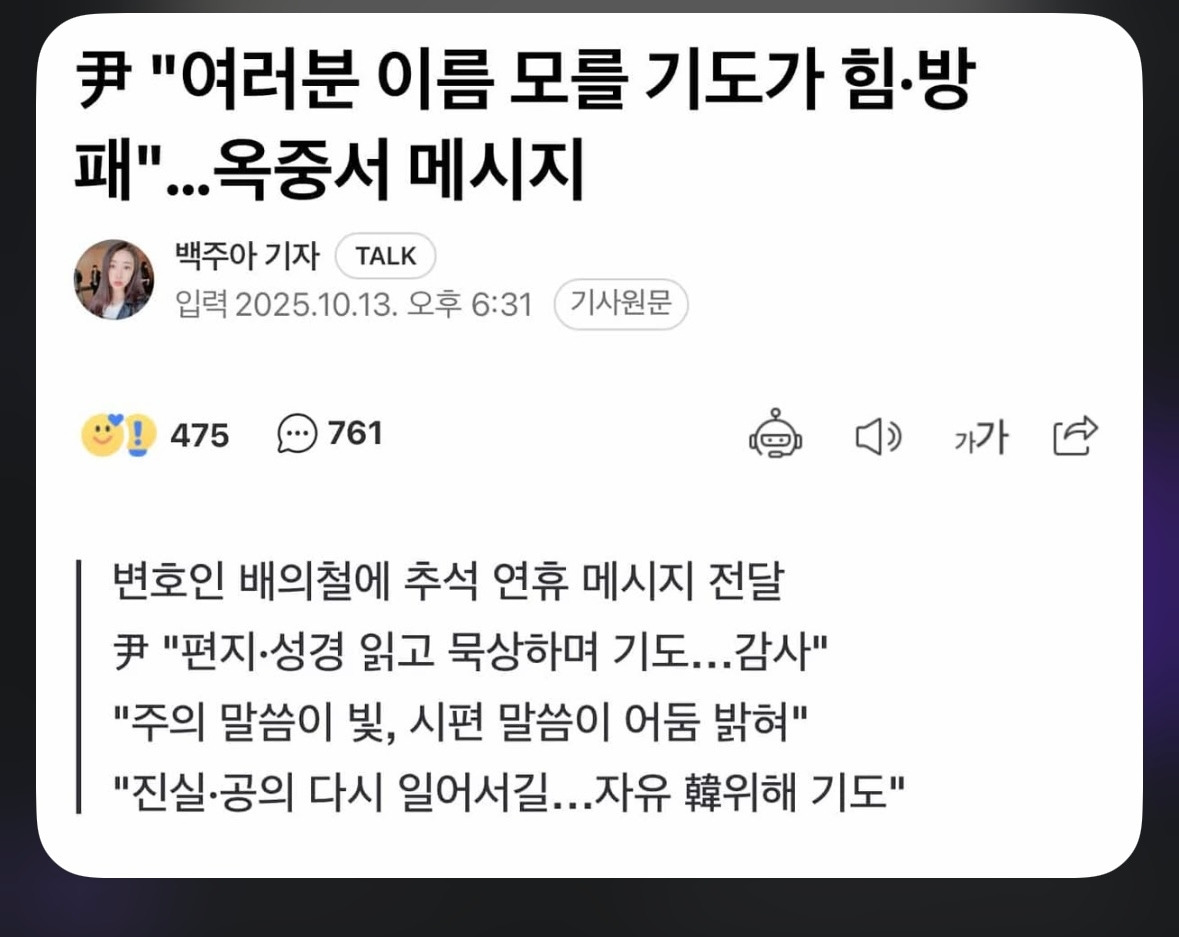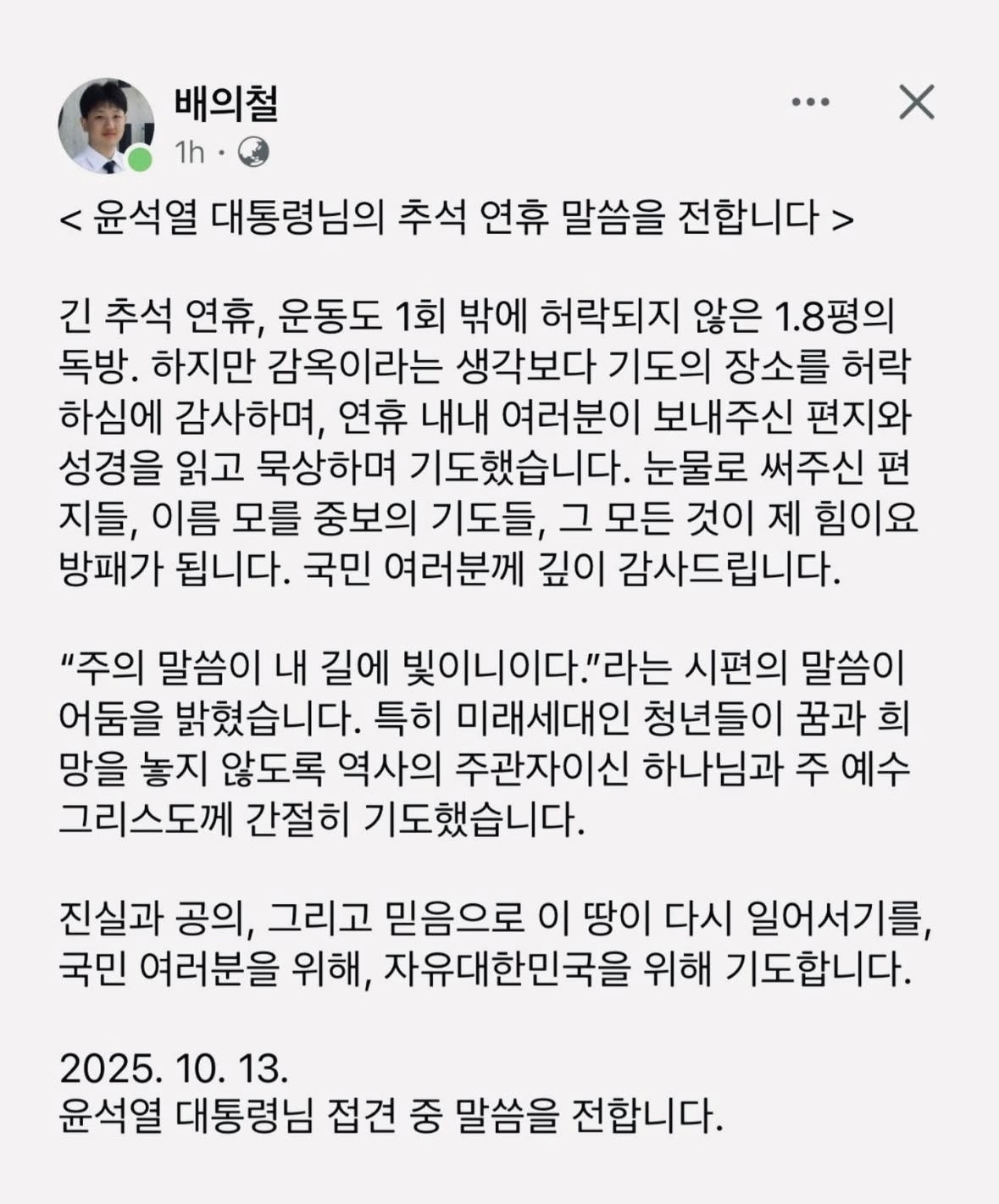 긴 추석 연휴, 운동도 1회 밖에 허락되지 않은 1.8평의 독방. 하지만 감옥이라는 생각보다 기도의 장소를 허락 하심에 감사하며, 연휴 내내 여러분이 보내주신 편지와 성경을 읽고 묵상하며 기도했습니다. 눈물로 써주신 편지들, 이름 모를 중보의 기도들, 그 모든 것이 제 힘이요 방패가 됩니다. 국민 여러분께 깊이 감사드립니다.