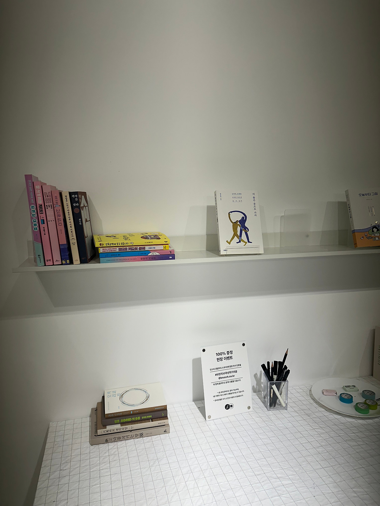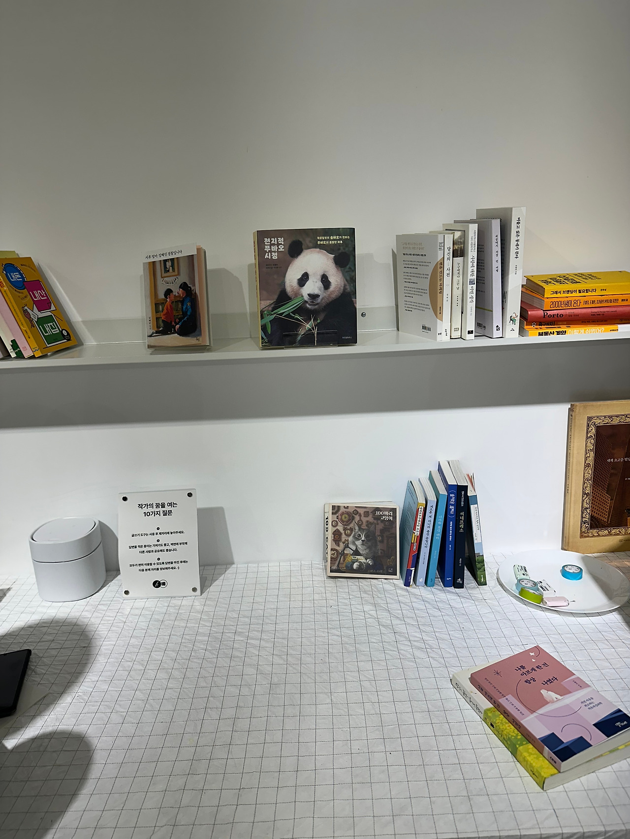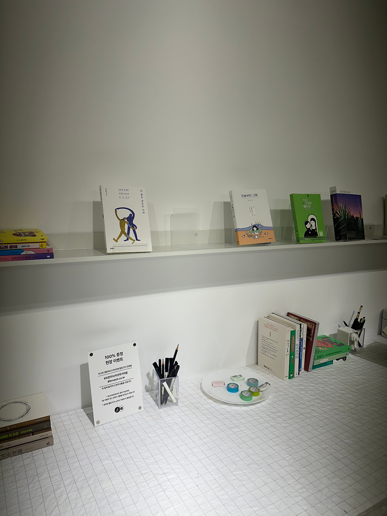 일층, 이층까지 구경을 마치고 삼층으로 올라가 시계를 확인했다. 30분이 지나있었다. 직원분이 힘들어하실 거라는 생각에 마음이 급해져서 급하게 구경을 하고 내려가야지 싶은 찰나에 출간 작가들의 에세이 책을 훑어보니 생각보다 재미있어서 그만 세 권이나 읽게 되었다. 다시 시간을 확인하니 1시간이 조금 지나있었다. 급한 발걸음으로 일층으로 안내받은 선물을 받고 부랴부랴 콘이에게 달려갔다. 다행히 콘이는 직원분 품에 얌전히 안겨있었다. 다소 유별나고 시끄럽고 예민한 콘이라 걱정을 했는데 다행이라는 생각이 들며 직원분에게 너무 감사한 마음이 들었다. 연신 감사하다는 나의 인사에 직원분은 괜찮다며 자신도 강아지를 키운다며 아이의 이름을 물었다. 여러 직원분들의 배려 덕분에 무사히 전시회를 관람할 수 있었고 안전하게 콘이를 잘 보살펴 주신 직원분에게 다시 한번 글로 감사 인사를 드리고 싶다. 곤경에 처해있는 사람에게 도움의 손길을 내밀고 친절한 미소를 지으며 말을 건네는 사람으로 살아야겠다는 다짐을 다시 한번 하게 되는 날이었다.