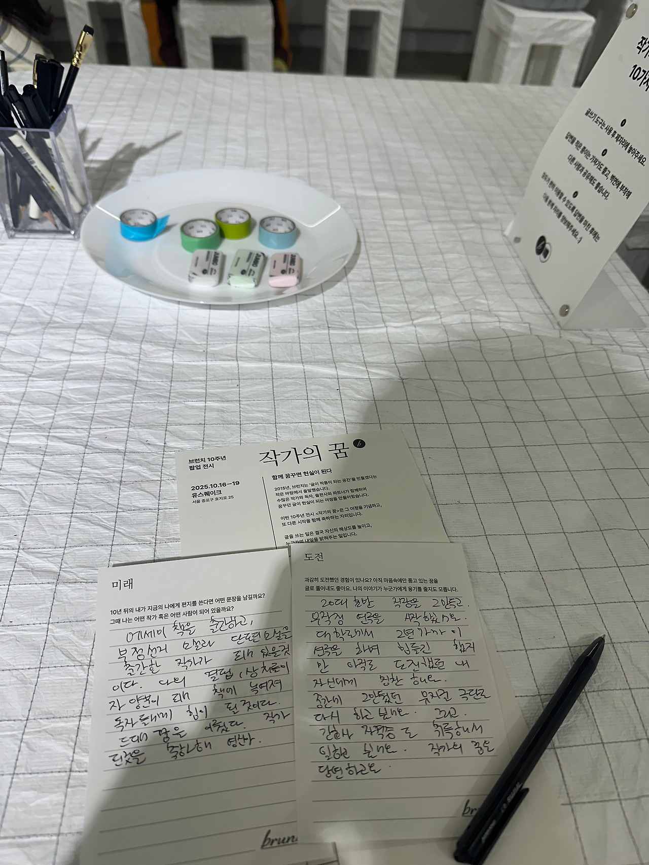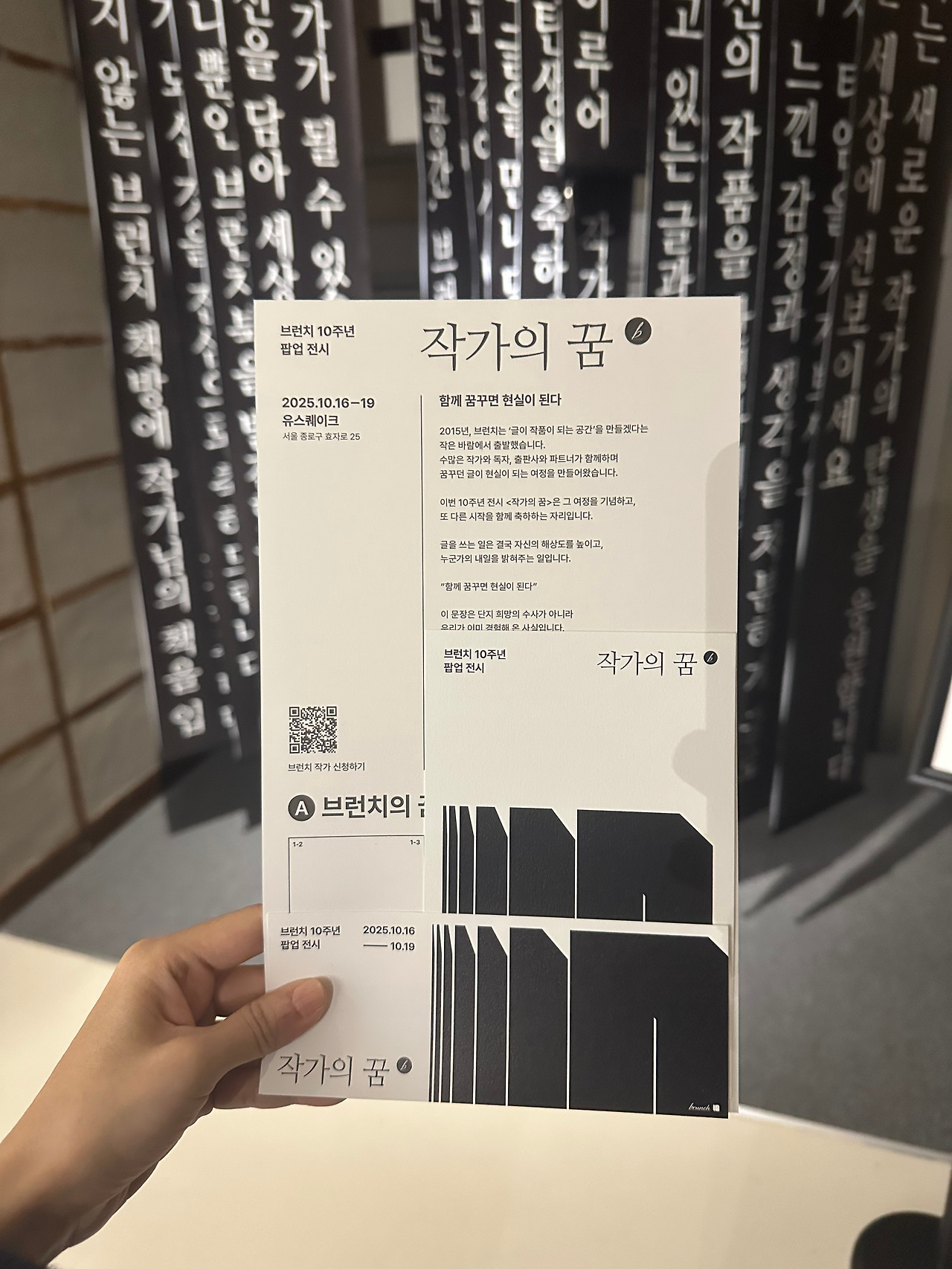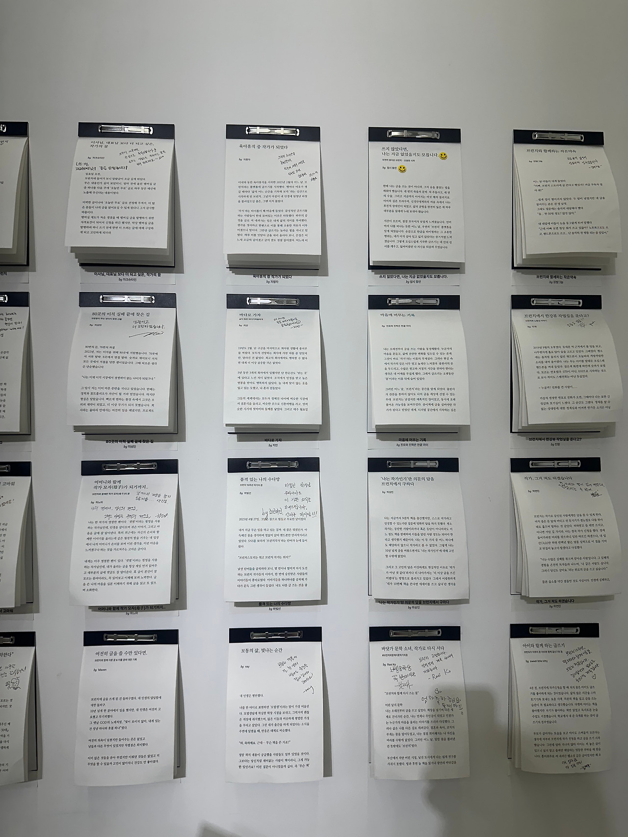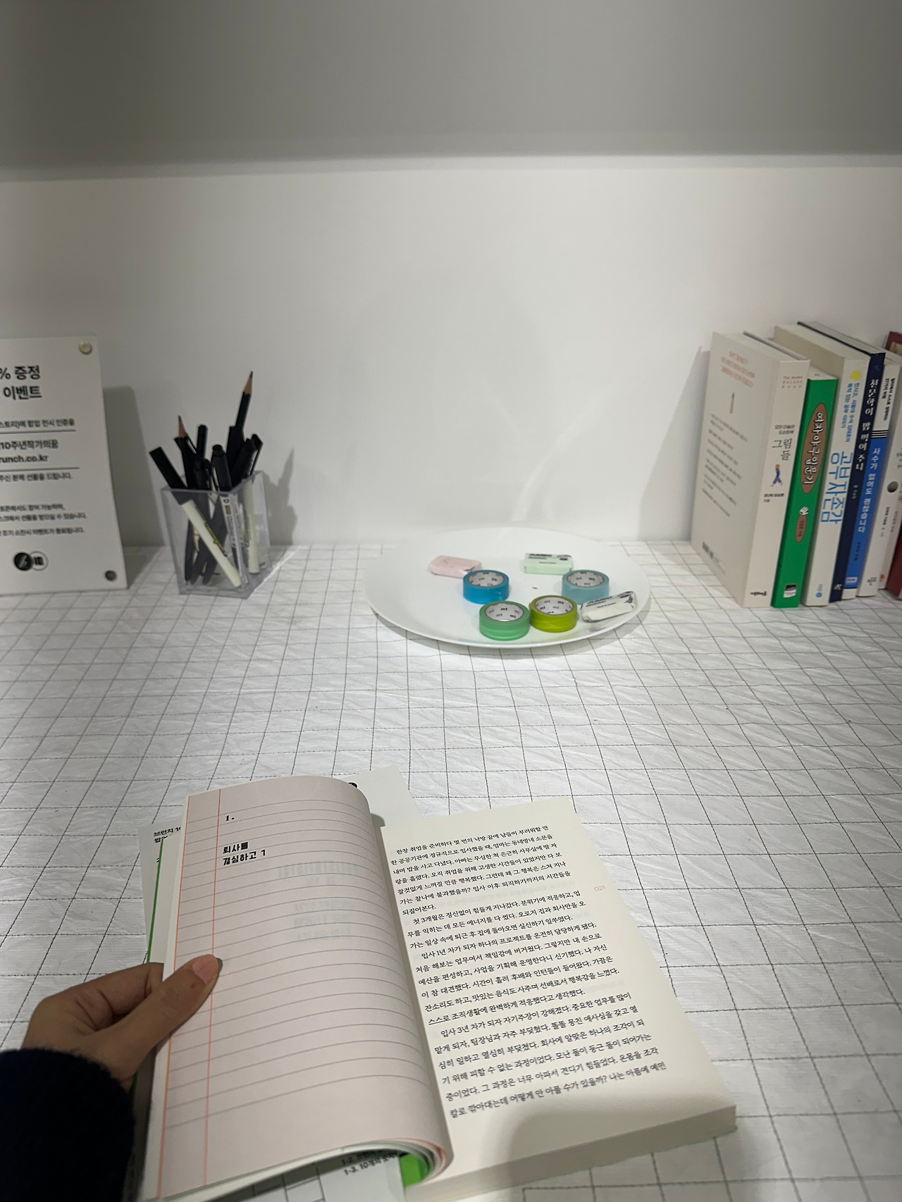 일층, 이층까지 구경을 마치고 삼층으로 올라가 시계를 확인했다. 30분이 지나있었다. 직원분이 힘들어하실 거라는 생각에 마음이 급해져서 급하게 구경을 하고 내려가야지 싶은 찰나에 출간 작가들의 에세이 책을 훑어보니 생각보다 재미있어서 그만 세 권이나 읽게 되었다. 다시 시간을 확인하니 1시간이 조금 지나있었다. 급한 발걸음으로 일층으로 안내받은 선물을 받고 부랴부랴 콘이에게 달려갔다. 다행히 콘이는 직원분 품에 얌전히 안겨있었다. 다소 유별나고 시끄럽고 예민한 콘이라 걱정을 했는데 다행이라는 생각이 들며 직원분에게 너무 감사한 마음이 들었다. 연신 감사하다는 나의 인사에 직원분은 괜찮다며 자신도 강아지를 키운다며 아이의 이름을 물었다. 여러 직원분들의 배려 덕분에 무사히 전시회를 관람할 수 있었고 안전하게 콘이를 잘 보살펴 주신 직원분에게 다시 한번 글로 감사 인사를 드리고 싶다. 곤경에 처해있는 사람에게 도움의 손길을 내밀고 친절한 미소를 지으며 말을 건네는 사람으로 살아야겠다는 다짐을 다시 한번 하게 되는 날이었다.