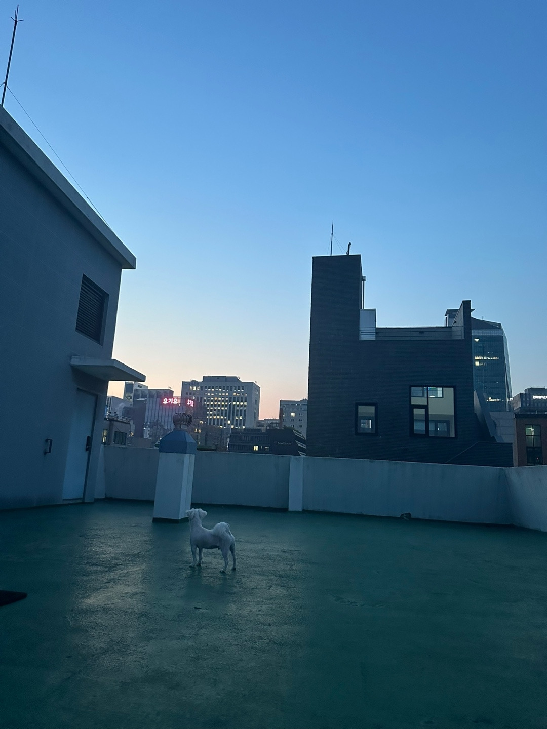이번 주 주말은 우리 집 옥상에서 돗자리를 깔고 팝콘이와 누워서 해 질 녘을 감상하였다. 하늘이 불그스레한 그 시간과 풍경이 나는 너무나 좋다. 고요해지며 마치 우주와 더 가까워지는 기분이 든다. 오늘의 구름 모양은 어제와 이렇게 다르구나라고 생각하고 있으면 팝콘이는 옆 건물 옥상에서 담배 피우고 있는 아저씨에게 왈왈 크게 짖는다. 팝콘아 그만해. 아기를 진정시키면 자꾸 바람에 날아가는 돗자리가 내 얼굴을 찰싹 때린다. 그럼 나는 매번 피식 웃음을 짓고 콘이는 겁을 먹고 도망간다. 콘아 괜찮아. 이리로 와. 신발로 돗자리를 고정해도 자꾸 날아가니 에라 모르겠다 하고 돗자리에 반쯤 덮인 채로 눈을 감는다. 콘아 이제 저녁밥 먹으러 집으로 가자. 해가 어두워지면 돗자리를 접고 콘이는 옆에서 방방 두발로 점프를 한다.
