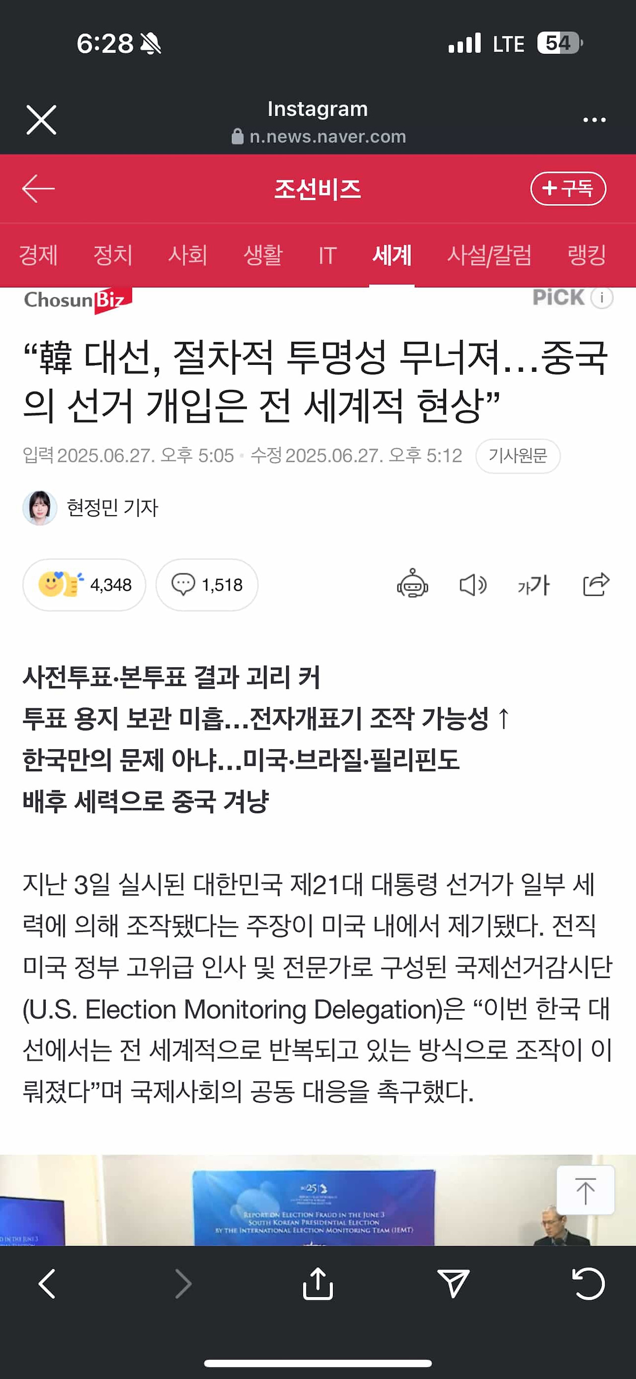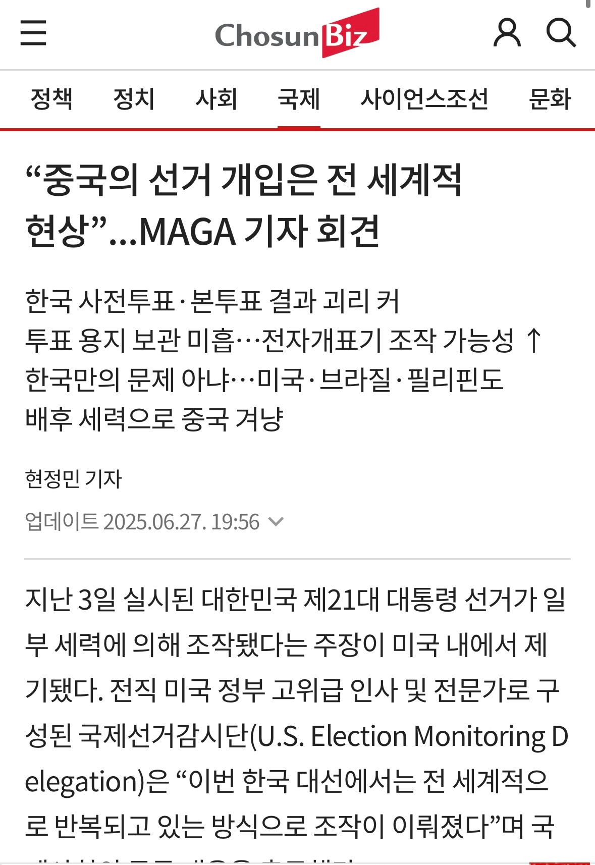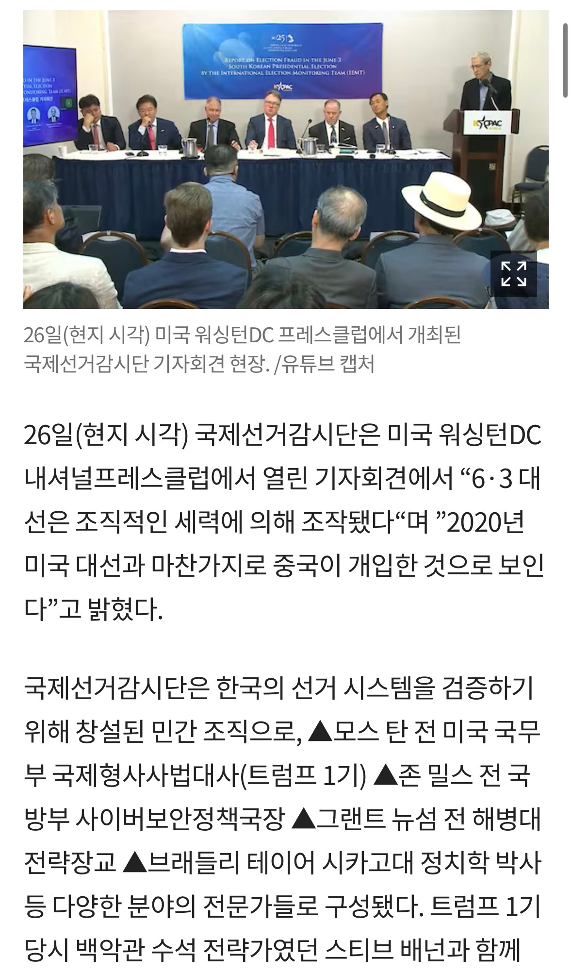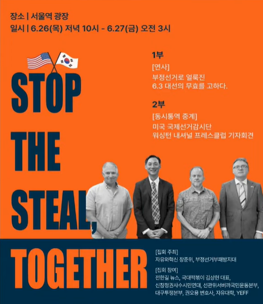 바로 어제인 6월 26일 저녁 10시, 서울역 광장에서 부정선거를 규탄하는 수많은 국민들이 모였다. 더불어 이날은 미국 국제선거 감시단 기자회견이 있는 날이었다. 그리고 실시간으로 워시턴방송이 송출되었다. 미국은 한국 투표에 중국의 개입이 있었다는 것을 확신하고 증거물들을 바탕으로 미국정부는 부정선거로 지정한다고 하였다. 또한 미국정부는 한국 정부에 공식적으로 부정선거 특검을 요청할 것이며 만약 이것을 거부할 시 미국정부는 본격적으로 한국 정부에 강력히 개입하고 미국정부 사람들을 파견할 것이라고 입을 열었다. 이것은 단순한 문제가 아닌 미국 민주당에서도 부정선거가 이루어지고 있다는 의미이다.