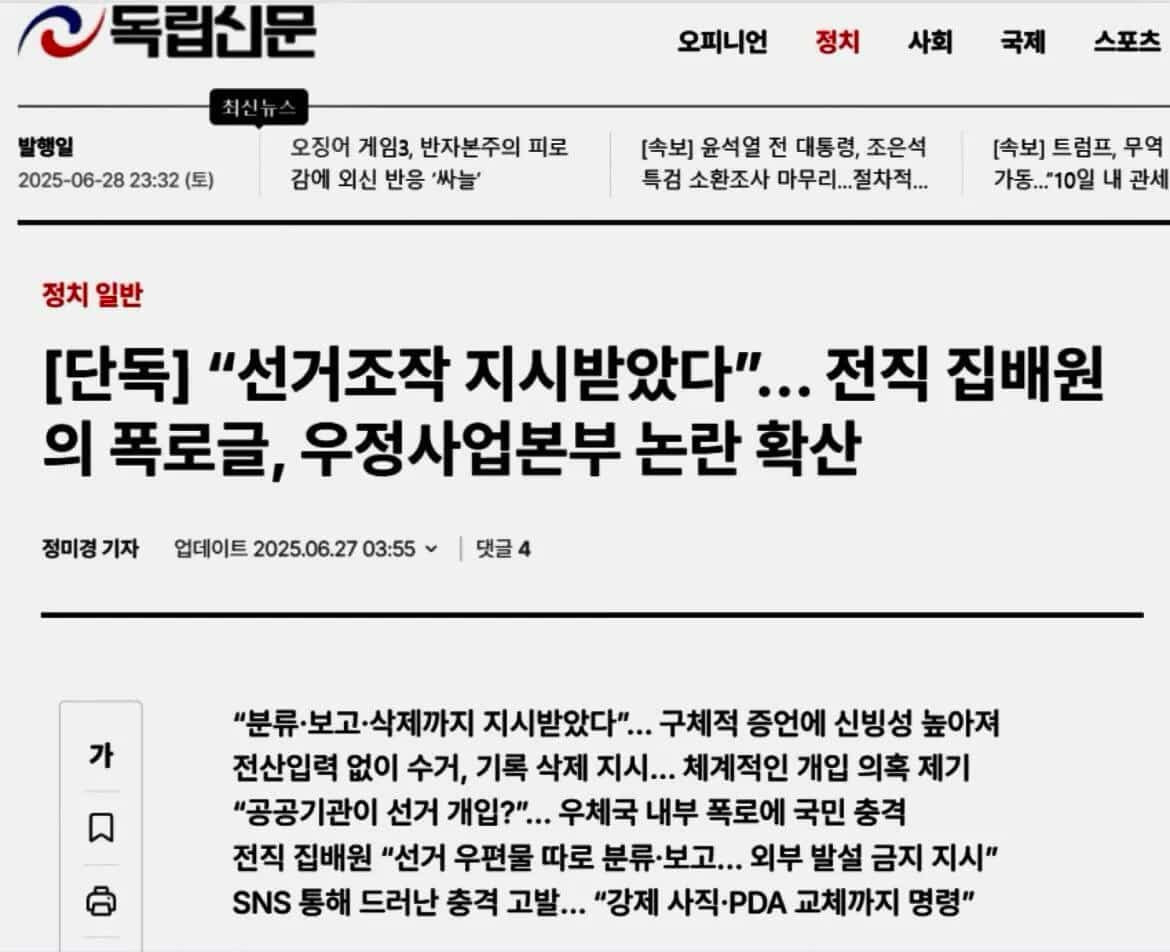 존 밀스 봇 전 육군 대령은 '한국 부정선거의 기획자는 중국공산당 왕후닝'이라고 입을 열었으며 그랜트 뉴섬 전 해군 장교는 '한국 중앙 선관위는 국제선거법 위반'이라고 말하였다. 이처럼 한국은 중국 텐센트의 개입을 받고 있다. 또한 얼마 전 충격적인 기사 하나를 읽었는데 전직 집배원이 선거 조작의 지시를 받았다는 폭로글이었다. 게다가 분류, 보고, 삭제라는 지시를 받으며 외부 발설 금지라는 지시까지 있었다며 구체적인 증언을 하였다. 이처럼 공공기관이 선거에 개입하고 있다는 사실을 우리는 알 수 있다.
