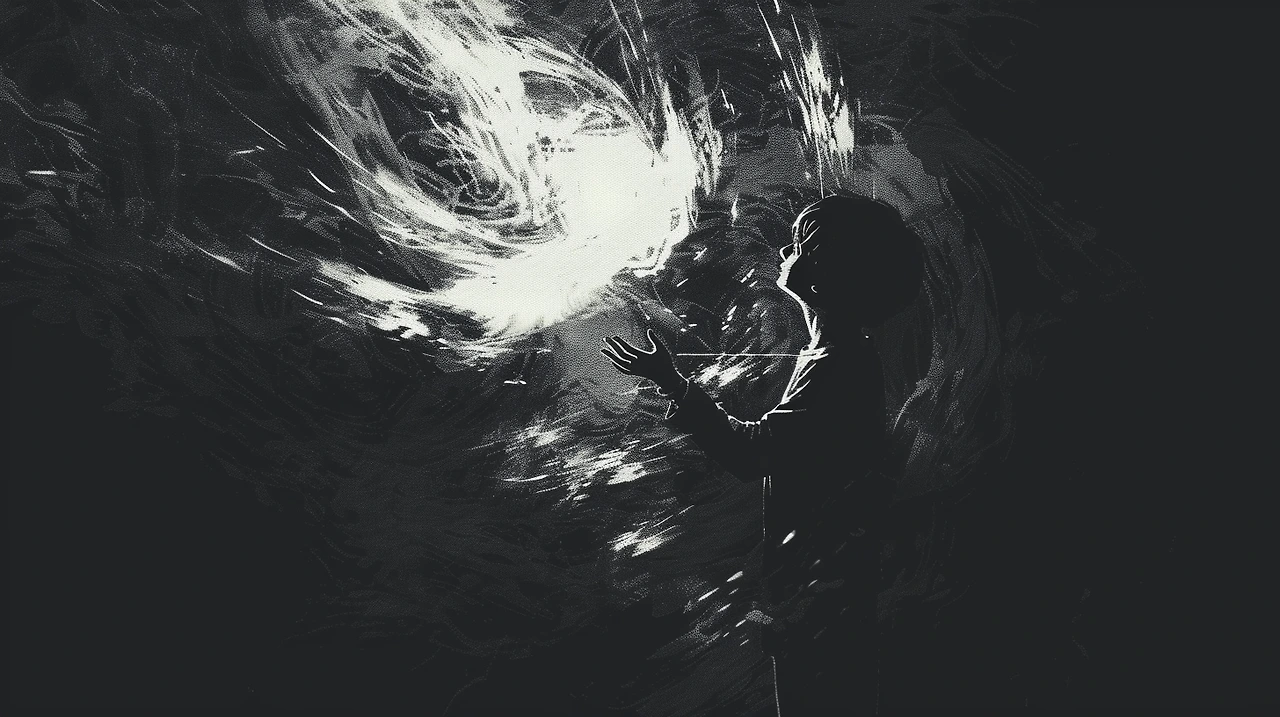 prompt: A monochromatic illustration of a child actively moving their hands, creating dynamic patterns of light and shadow in the darkness. The child’s gestures are expressive and fluid, as if weaving a story or painting with light. Soft, radiant beams and intricate shadows flow outward from the movements, forming shapes that seem alive, symbolizing silent communication. The surrounding void is deep black, contrasting with the luminous, shifting forms, evoking a sense of quiet creativity and unseen connection. --ar 16:9 --v 6.0