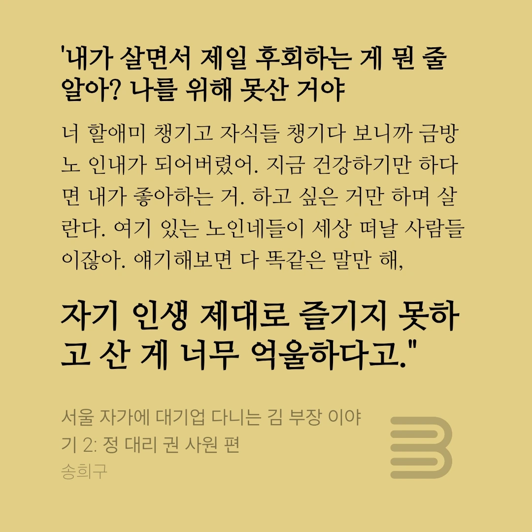 두렵거나 현실의 장벽 앞에서 하지 못한 일에 대한 후회였다. 마음껏 누릴 수 있는 기회가 주어진 당신에게 지금 뭘 해야 할까!