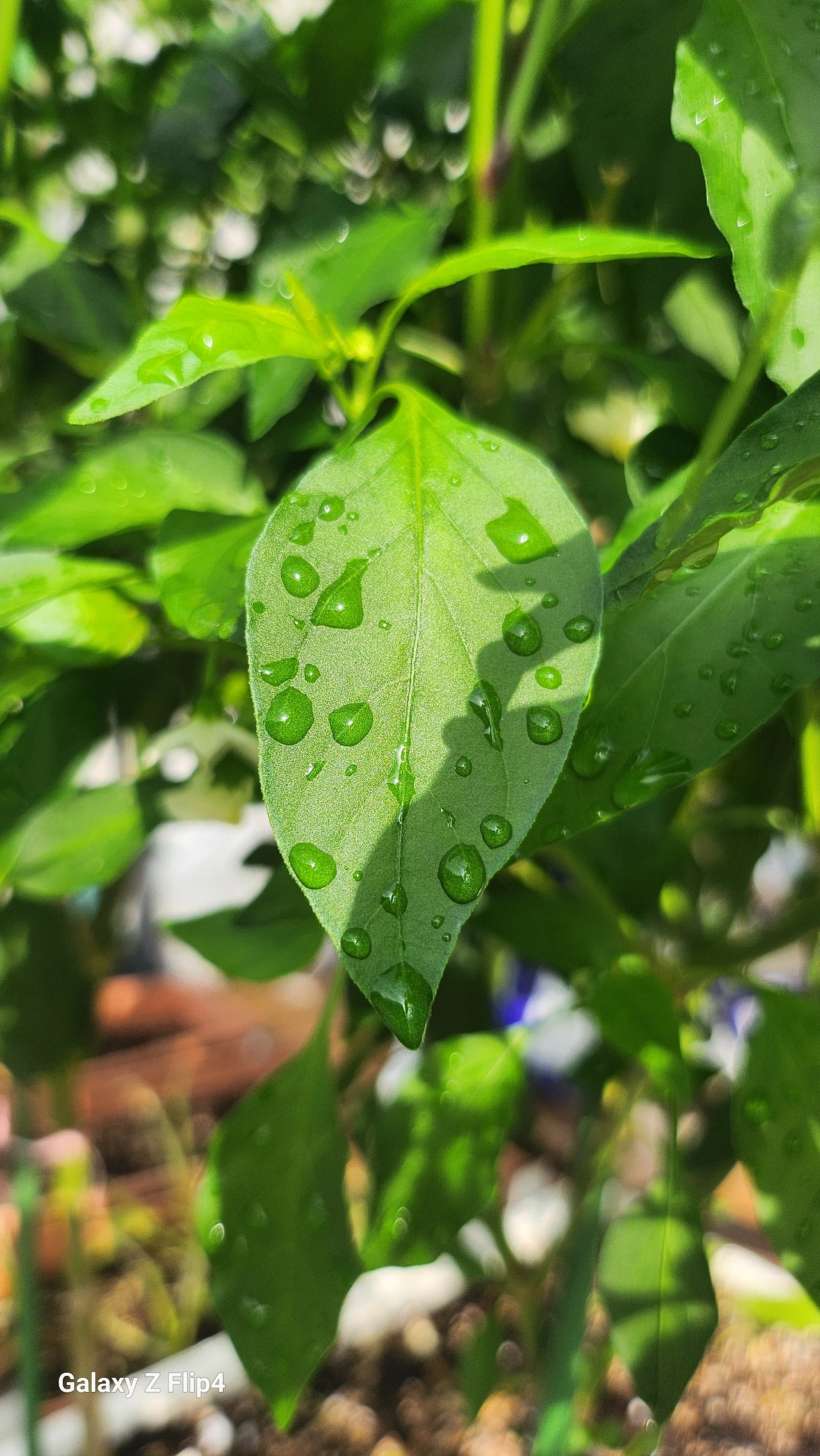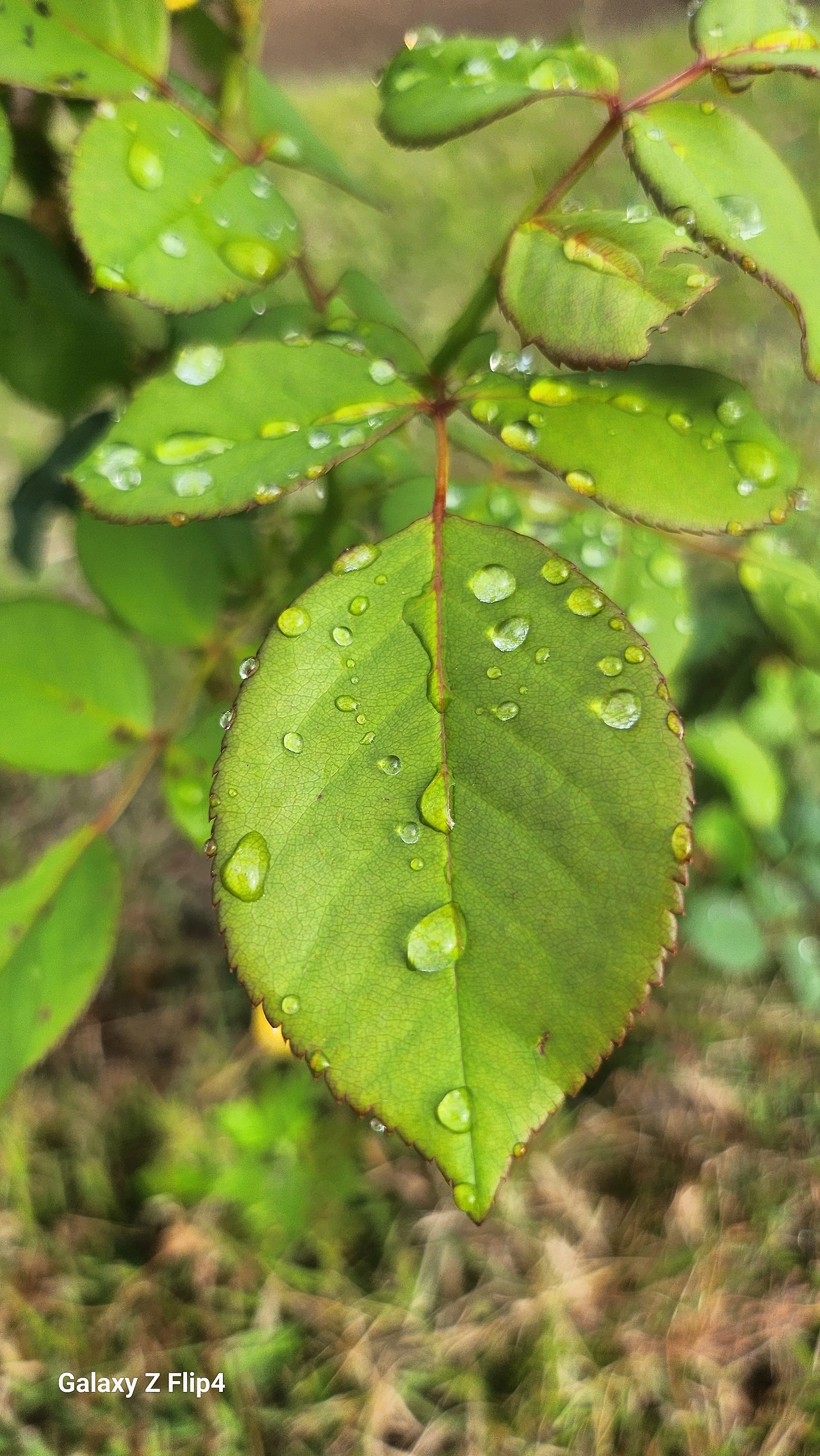 이파리에 작은 물 방울이 안간힘을 쓴다.