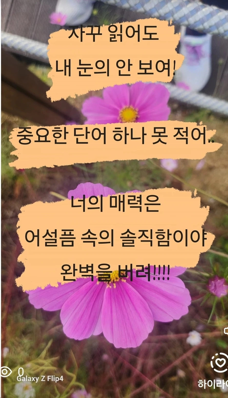 마음의 담아 두지 않은 오빠의 솔직한 발언이 아직도 기억이 생생하다. 그때부터 브런치나 블로그나 밴드의 밥 먹듯이 끄적인다. 내 색깔이 있기에 부족한 부분은 독자가 알아서 패스한다. 이젠 끄적임이 나의 속삭임이 되었다. 글은 나였다.