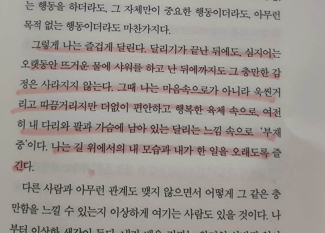 "나는 즐겁게 달린다. 달리기가 끝난 뒤에도 심지어는 오랫동안 뜨거운 물에 샤워를 하고 난 뒤에까지 그 충분한 감정은 사라지지 않는다. 그때 나는 마음 속으로 욱신거린 따끔거리지만 더없이 편안하고 행복한 육체 속에서, 여전히 내 다리와 팔과 가슴에 남아 있는 달리는 느낌 속으로 "부재중"이다.