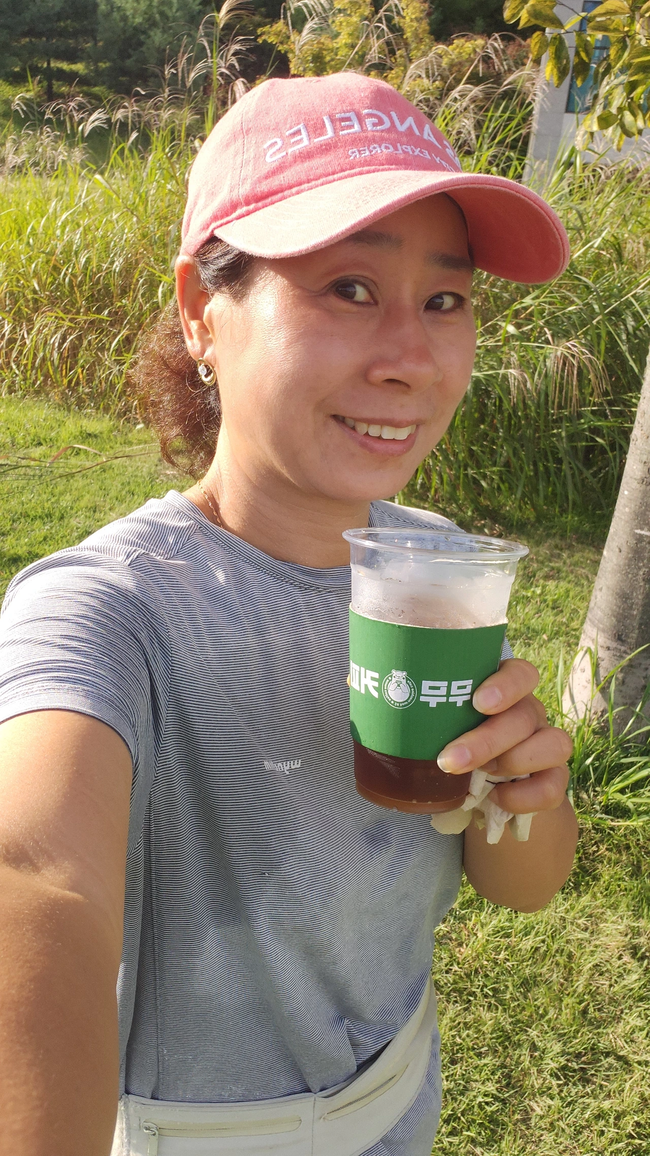 10킬로 완주 후에 시원한 아.아와 활기차게 하루를 연다.