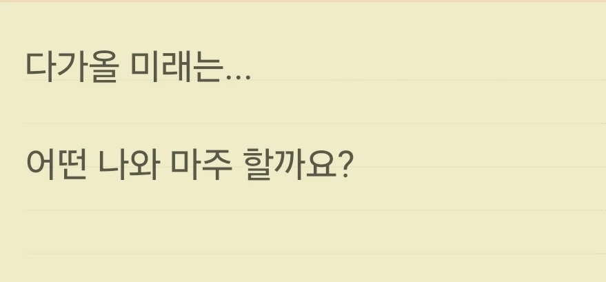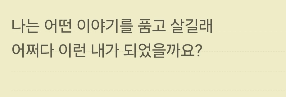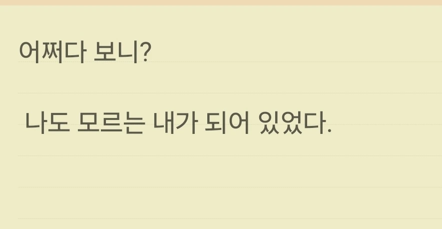 우연히 심리 상담가 박상미 교수님의 강연회에 참석했을 때 이 문구를 접하고 나서부터 스스로 많은 질문을 던지며 사소한 변화를 시도하고 살고 있다. 눈치 보며 사는 삶보다 나와 싸우는 시간이 더 행복하다. 남이 아닌 나로 초점을 맞추다 보니 내 안의 작은 뿌듯함이 올라온다. 그거였다.