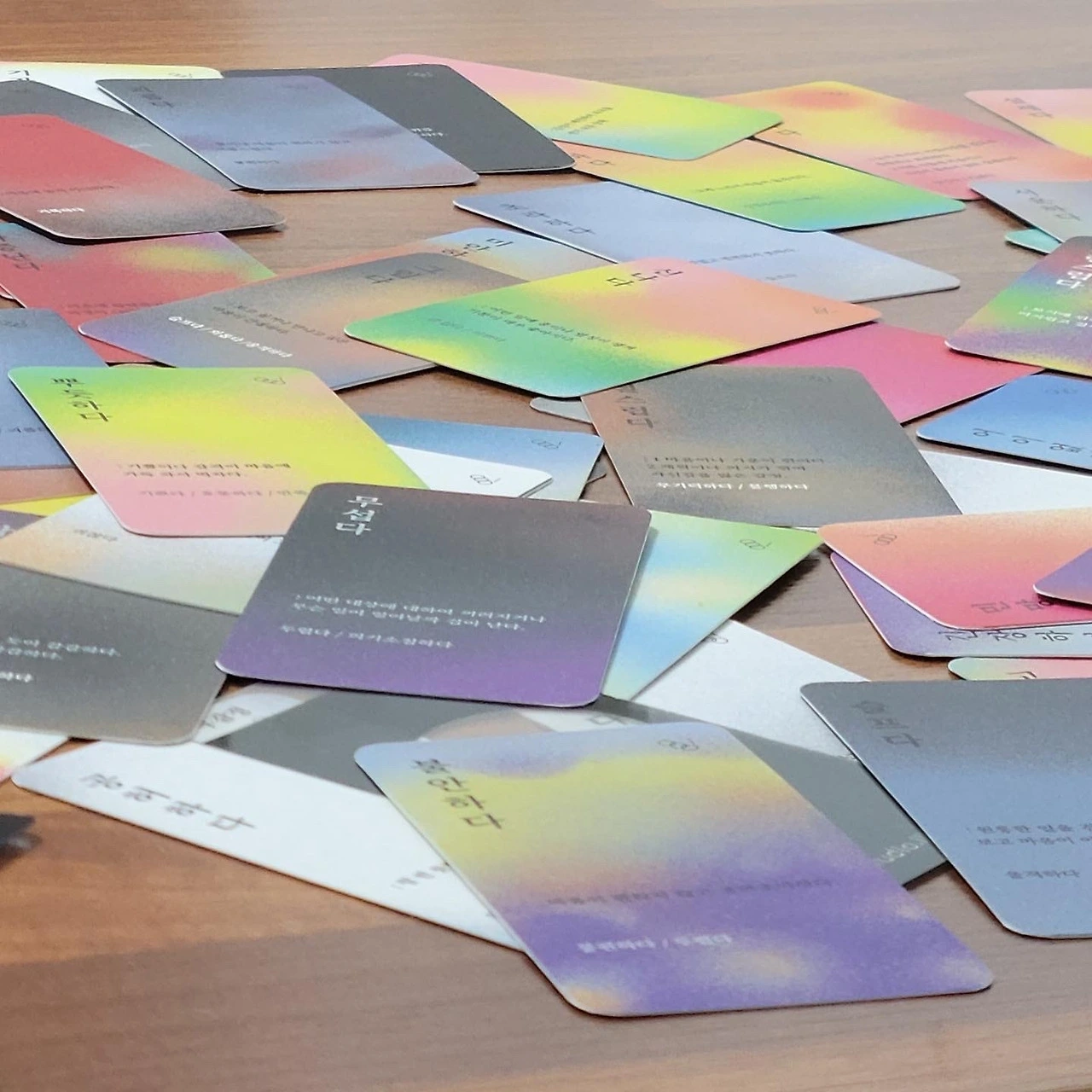 그 팀원이 캡처해서 올린 우리의 감정카드 사진은, 해당 감정의 색들을 조합하여 스프레이 브러시 툴로 색을 쌓아 그린 일러스트였다. 그 부분을 모방했다고 생각했으니 그걸 올렸겠구나- 하고 짐작할 수 있었다. 비슷하다고 볼 수 있다면 그러데이션 정도인데, 그 팀의 카드는 색채심리학을 바탕으로 한 '색'을 뽑는 카드도 아니고, 비슷한 주제의 카드들을 분류하기 위해 1-3가지의 색의 그러데이션으로 연출한 것이어서 비슷하다고 보기가 어렵다.