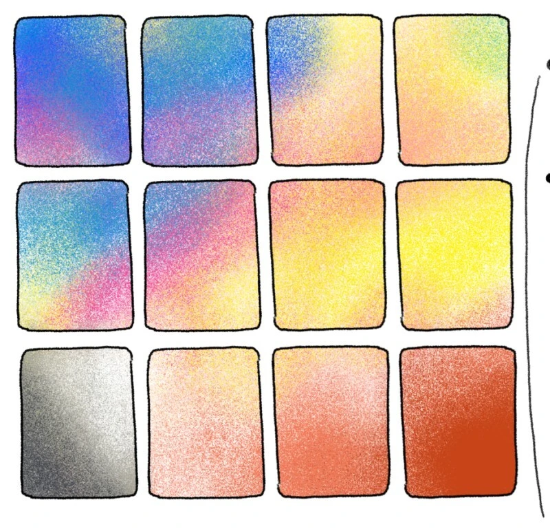 감정들이 1-2가지 컬러가 아닌 미묘한 감정들이 섞인 다채로운 컬러로 표현하고자 했고. 서로 영향을 주고받는 일러스트로 표현하고자 했다. 그 영향은 단순한 그러데이션이 아닌 서로에게 스며드는 느낌이 들었으면 했다. 그래서 내가 즐겨 쓰는 스프레이 브러시를 이용해 미묘한 감정의 흐름과 섞임 들을 표현하면서 초안을 그렸다.