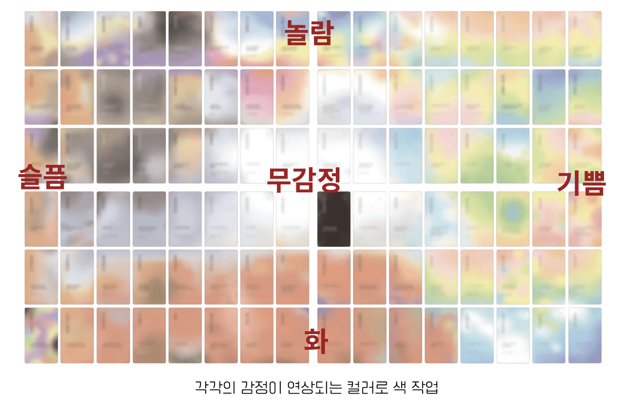 어떤 형상이 명확하게 보이기 보다 색만으로 감정이 드러나도록 색을 계속 뿌리고 지우고 쌓으며 브러시질을 백만 번도 더 했다. 가장 먼저 노랑을 깔고 각 기본 감정들이 나타내는 색들 슬픔-채도 낮은 푸른색, 놀람 -파랑과 대비 색, 화-빨강, 기쁨-따뜻하고 밝은 색, 무감정 - 흰색을 덮고, 한 장 한 장 칠해나갔다.