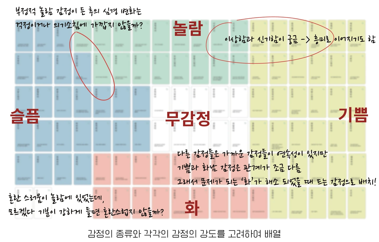 이후에 우희가 여러 감정 관련된 책을 읽다가 우리가 만든 감정 지도가 심리학자가 발표현 감정 원형모형과 흡사하다고 알려줬다. 조금 다른 부분(높은 각성과 낮은 각성으로 분류되어 있었다.)이 있긴 했지만 그 모형도 추후에 감정 지도가 완성되는 데 많은 도움이 됐다. 내가 글보다 시각적인(이미지) 것들로 정리하고 표현하고 만들어내는 일을 한다면 우희는 많은 책을 읽으며 이론적인 부분과 다양한 정보를 가져와 우리가 하는 감정카드 작업의 전문성을 높여나갔다.