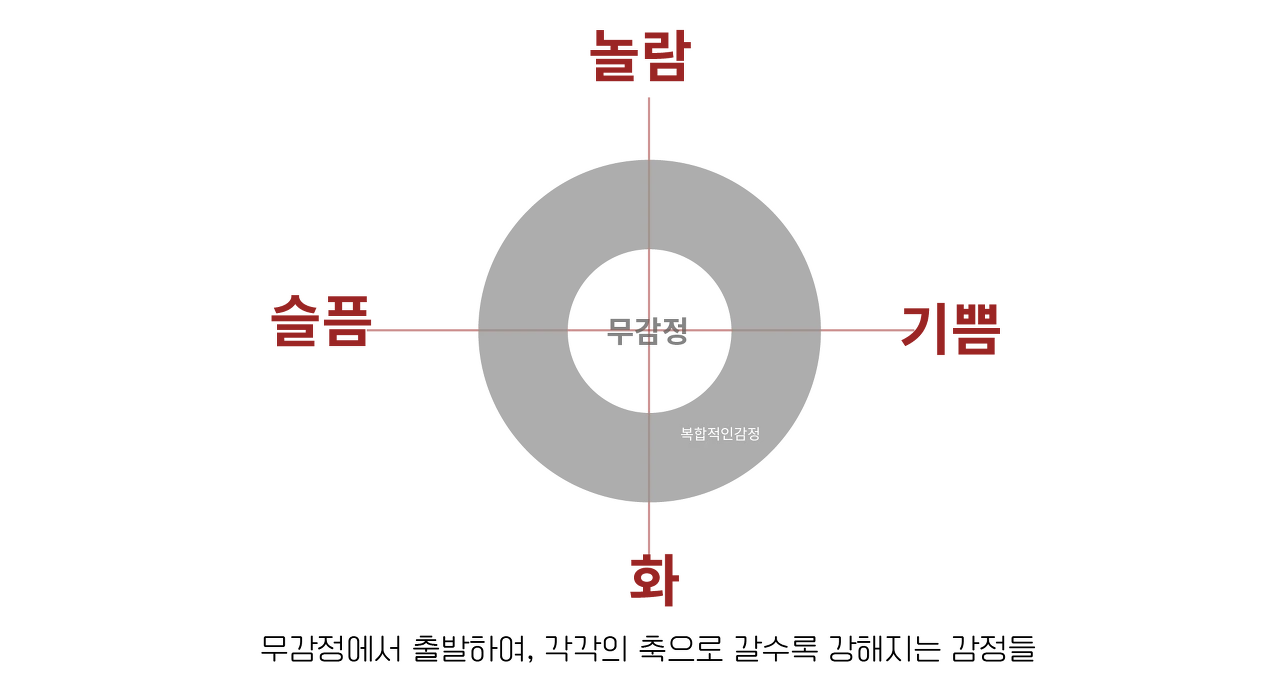 이 기본 감정들이 x,y값을 달리하면 감정과 감정 사이에 놓이면 복합적인 감정이 되고, 모두가 연관 지어 이어지지 않을까? 여러 감정이 비슷하게 작용을 한다면 오히려 복잡할 수도 또는 평온할 수도 있지 않을까? 이런 생각들이 마구 떠올랐다. 기획자 우희에게 바로 이 표를 설명하고, 우린 이런저런 얘기들을 했다. 감정카드 관련 회의를 할 때마다 몇 시간씩 시간 가는 줄 모르고 대화를 했던 것 같다.