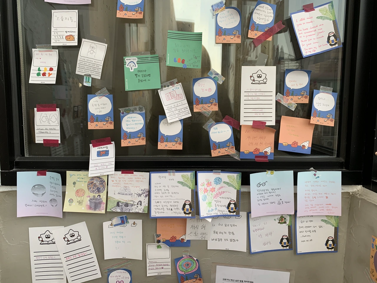 사람들이 내 만화를 봐줄까? 불특정 다수가 보는 공개된 공간인데, 자신의 이야기를 남겨줄까? 걱정이 많았는데, 오픈 후에 가보니 생각보다 많은 사람들이 들러주었고, 많은 메모들이 벽에 붙어있었다. 시간이 날 때마다 가서 메모들을 하나하나 다 읽어봤다. 그중엔 사랑고백을 하는 사람도 있고, 코로나가 시작된 지 얼마 안 되었을 때여서 속상함을 토로하는 사람도 꽤 있었고, 공무원 합격이 되었으면 하는 소원을 비는 사람도 있었다. 가슴 아픈 이야기를 꺼내 놓기도 하고, 좋은 이야기들을 나누고 싶어 적어놓는 사람도 있었다. 메모들을 보면서 속을 털어놓을 곳, 또 공유할 곳(누군가는 봐주었으면 하는)을 필요로 하는 사람이 많다는 것도 새삼 느꼈다.