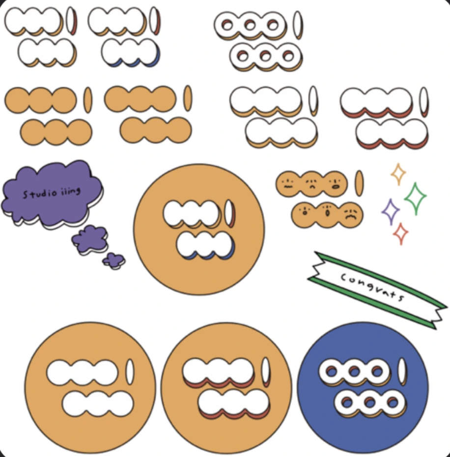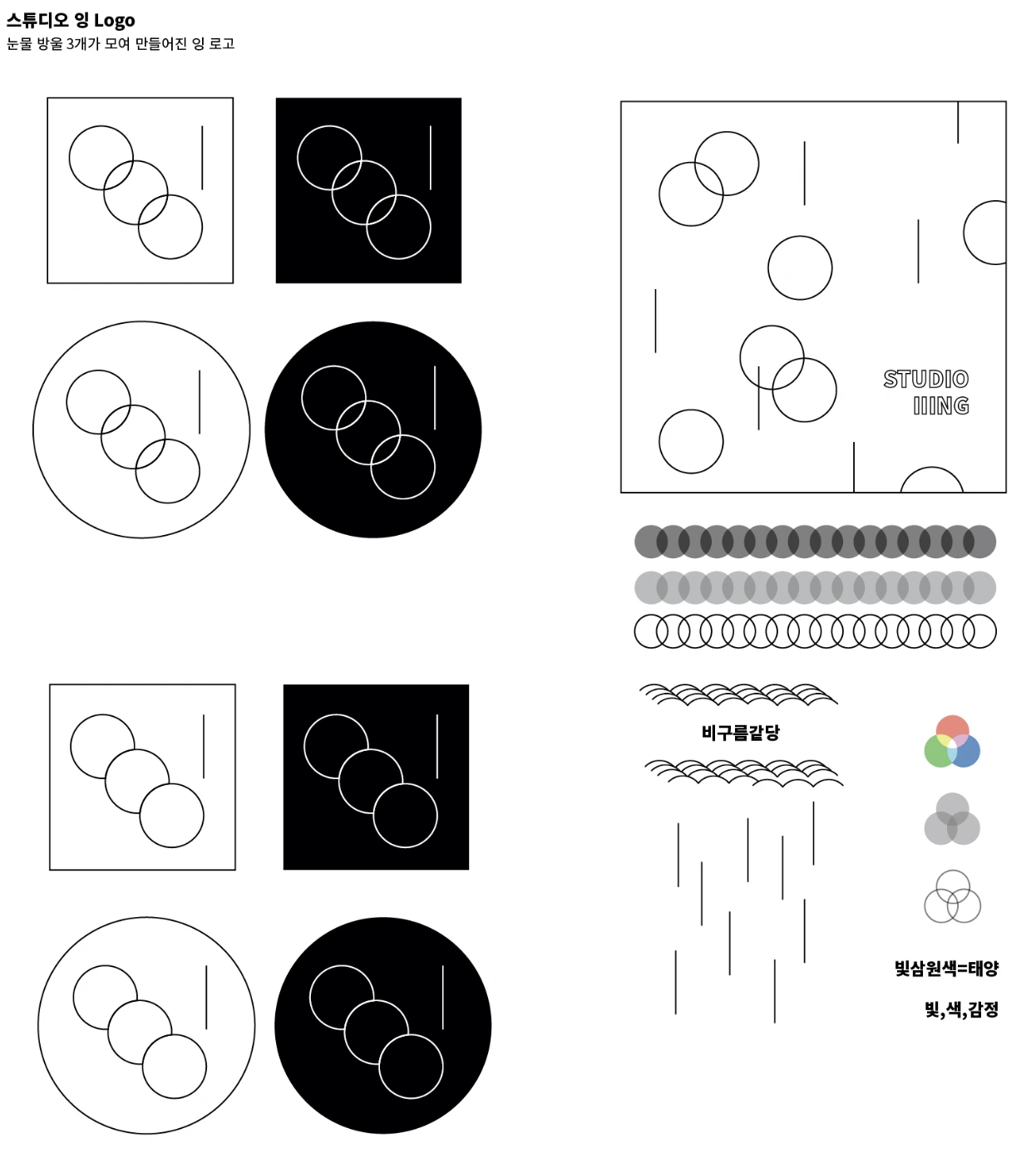 세 명의 떼잉 거리는 대화에서 탄생했기 때문에 세 명의 눈물방울인 원 세 개를 바탕으로 형상화하고 싶었다. 지금의 스튜디오 잉의 로고가 나오기 전까지, 요즈음 유행하는 레트로 감성을 넣어보기도 하고 말랑말랑해 보이는 귀여운 디자인을 만들어보기도 했다. 감정의 바탕인 노란색과 대비되는 파랑을 메인 컬러로 가져가면 좋을 것 같아서 두 컬러를 기준으로 다양한 색을 입혀보기도 했다. 감정과 감성적인 것들 다루는 스튜디오여서 너무 세련된 디자인은 어울리지 않을 것 같아 고민이 많았다.