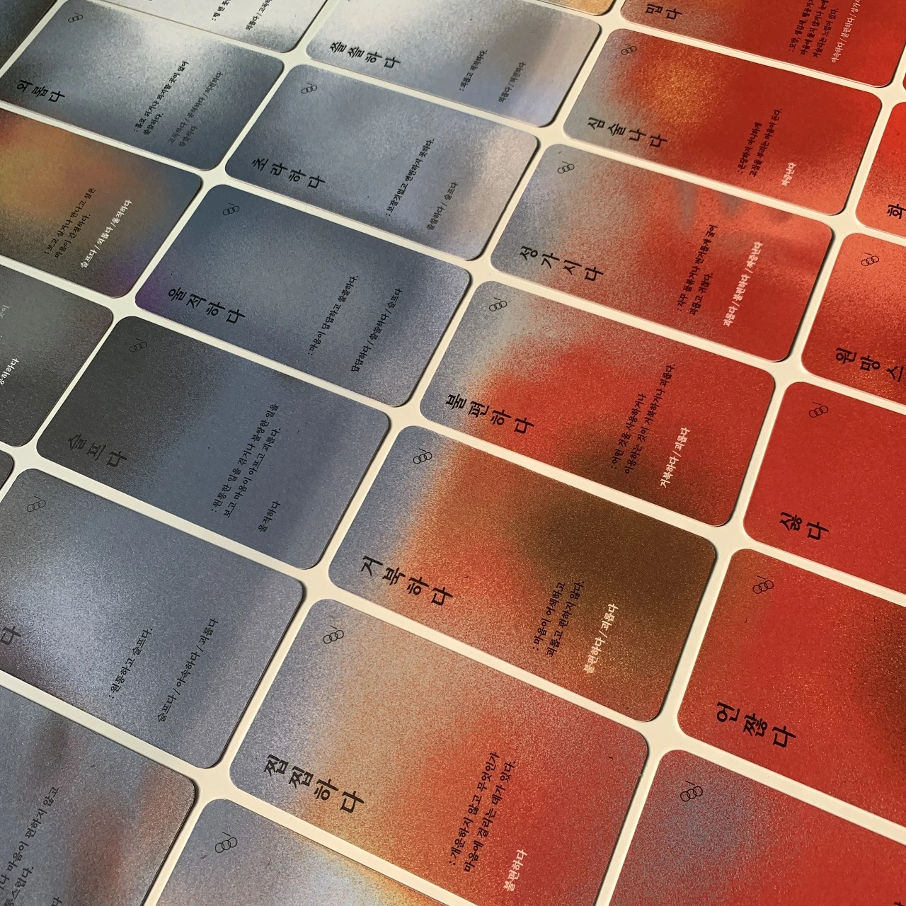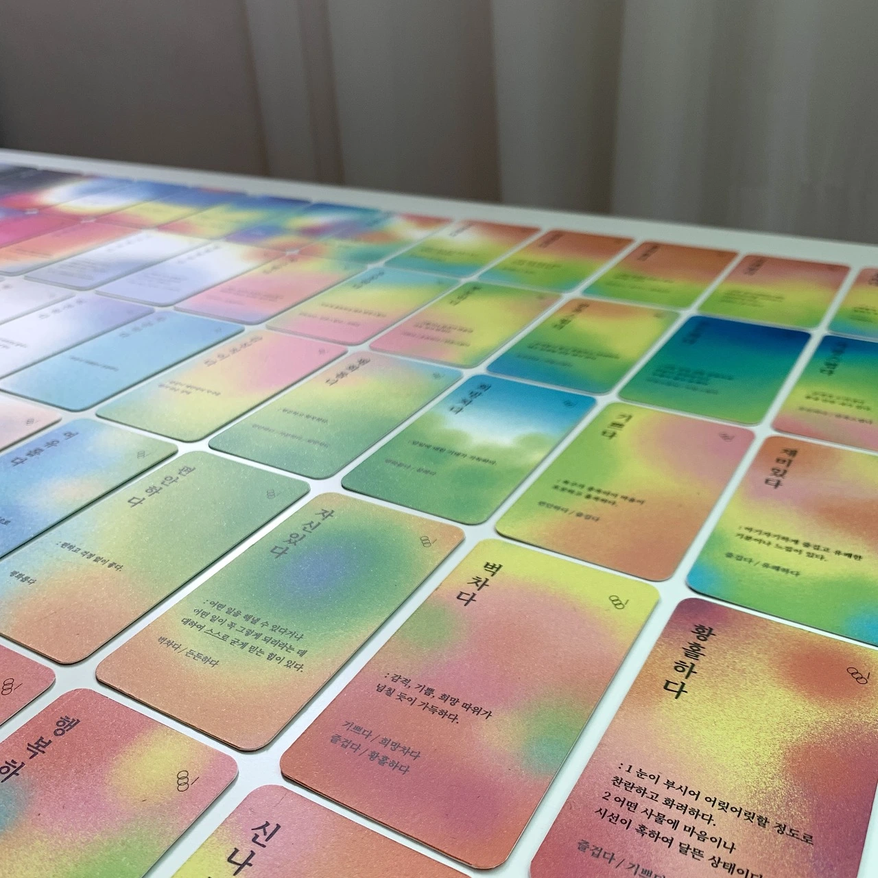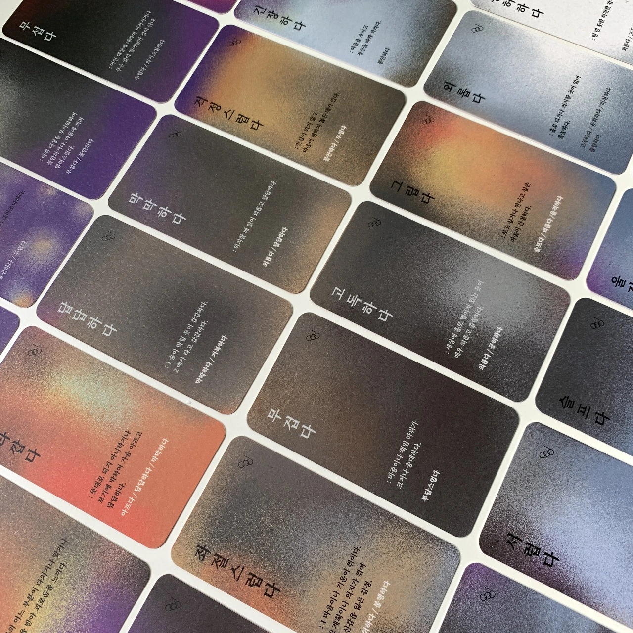 전체 샘플을 촬영하기 위해 펼쳐봤는데, 카드들이 생각보다 너무 예뻤다. 예쁜 결과물을 만들기보다 좋은 결과물을 만들고 싶었는데, 카드들이 너무 예뻐서.. 잘 만들어진 건가 싶었다. 우희와 나는 검열을 자주 하는 친구들이어서 끊임없이 의심하고 의심했다.