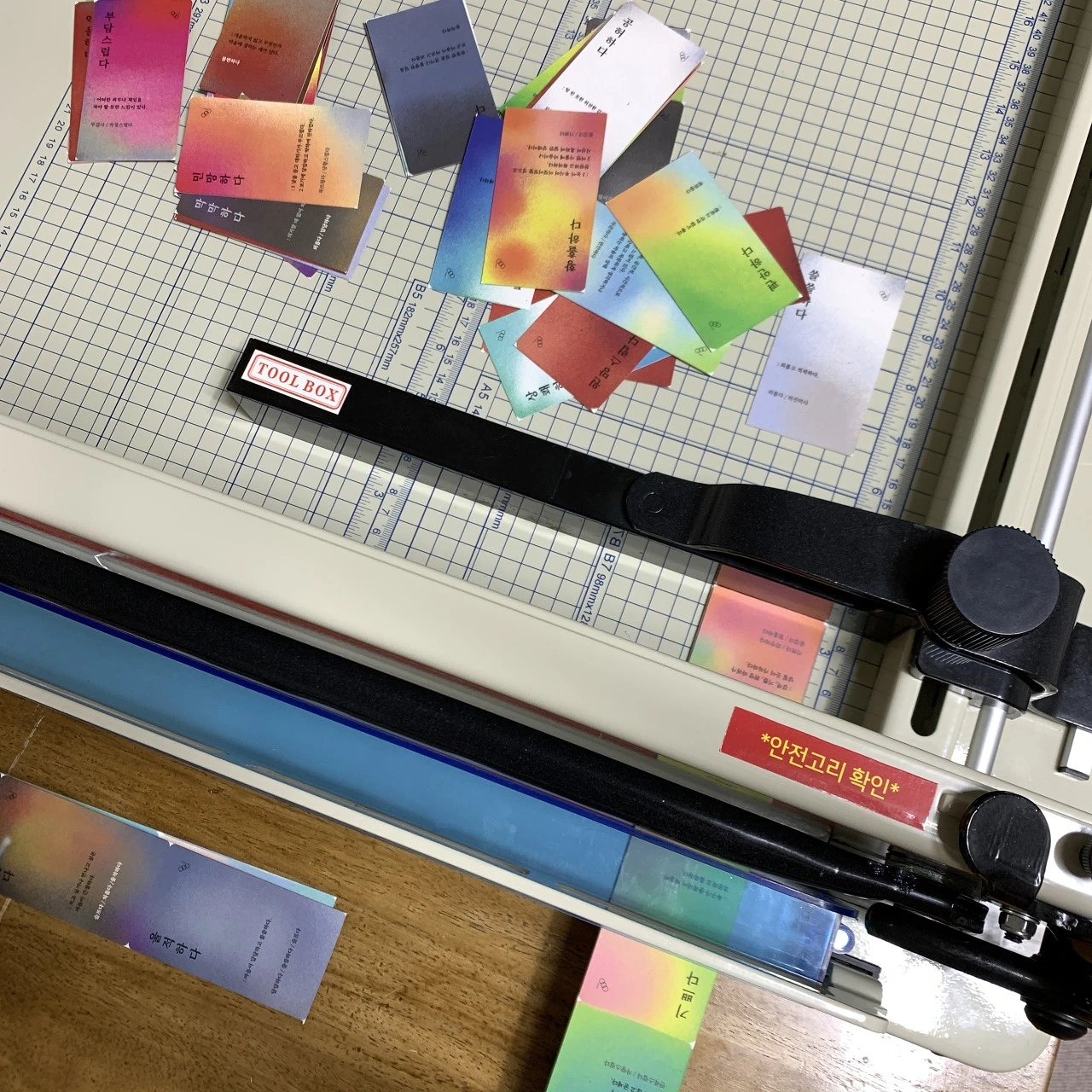 처음 맡겼던 샘플은 코팅을 하지 않아서, 테이프 등을 붙이니 색이 벗겨졌다. 내구성과 두께감을 주기 위해 코팅을 넣기로 하고, 감성적이고 부드러운 느낌을 주기 위해 무광코팅으로 다시 발주를 넣었다. 그리고 또 재단하고 모서리를 잘라냈다.