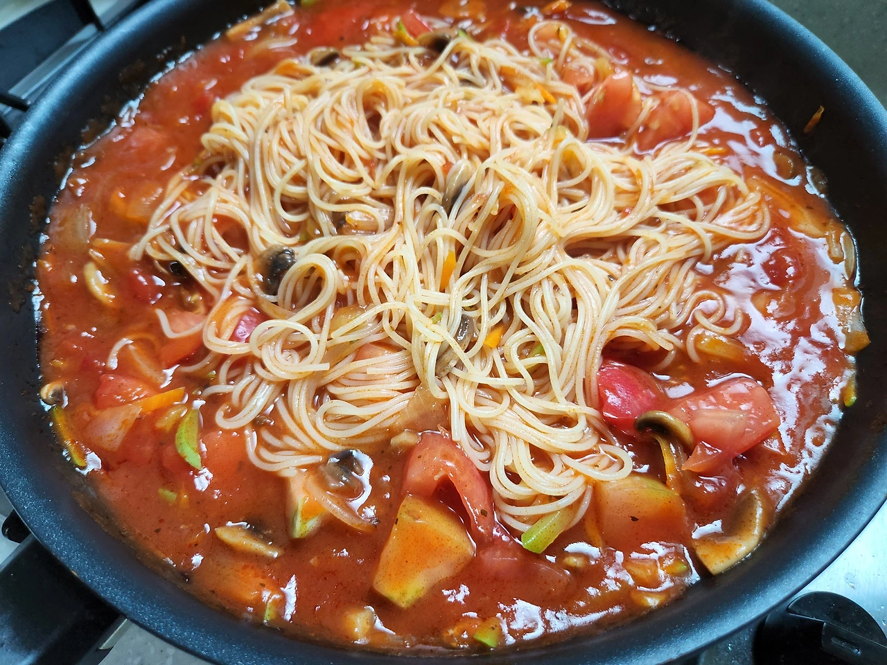 토마토파스타는 소스를 만들어내는 시간을 줄이고 시판용으로 한다. 어차피 토마토 페이스트에 토마토로 끓여내는 소스라 굳이 수고를 더 할 필요가 없다. 면은 조금 얇은 면(카펠리니)이 좀 색다른 맛을 준다. 얇으니 골고루 소스가 스며들어 깊은 맛을 더한다. 양파를 비롯해 그날 냉장고에 자리하고 있는 야채 몇 개를 썰어 넣고 올리브유에 볶다가 삶은 면을 넣어 볶고 거기에 시판 소스와 집에 혹시 있을 토마토를 잘게 썰어 넣어 볶는다.