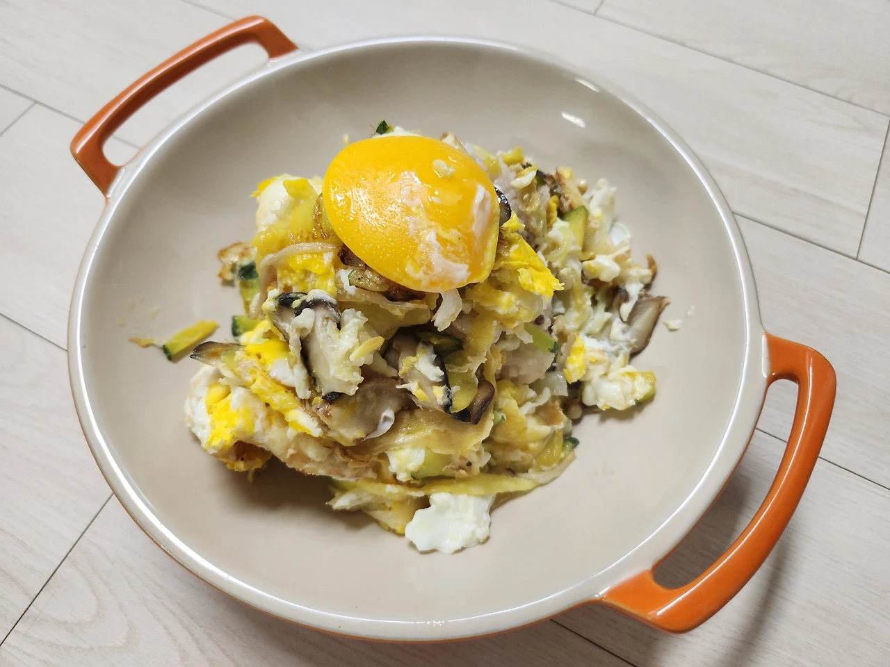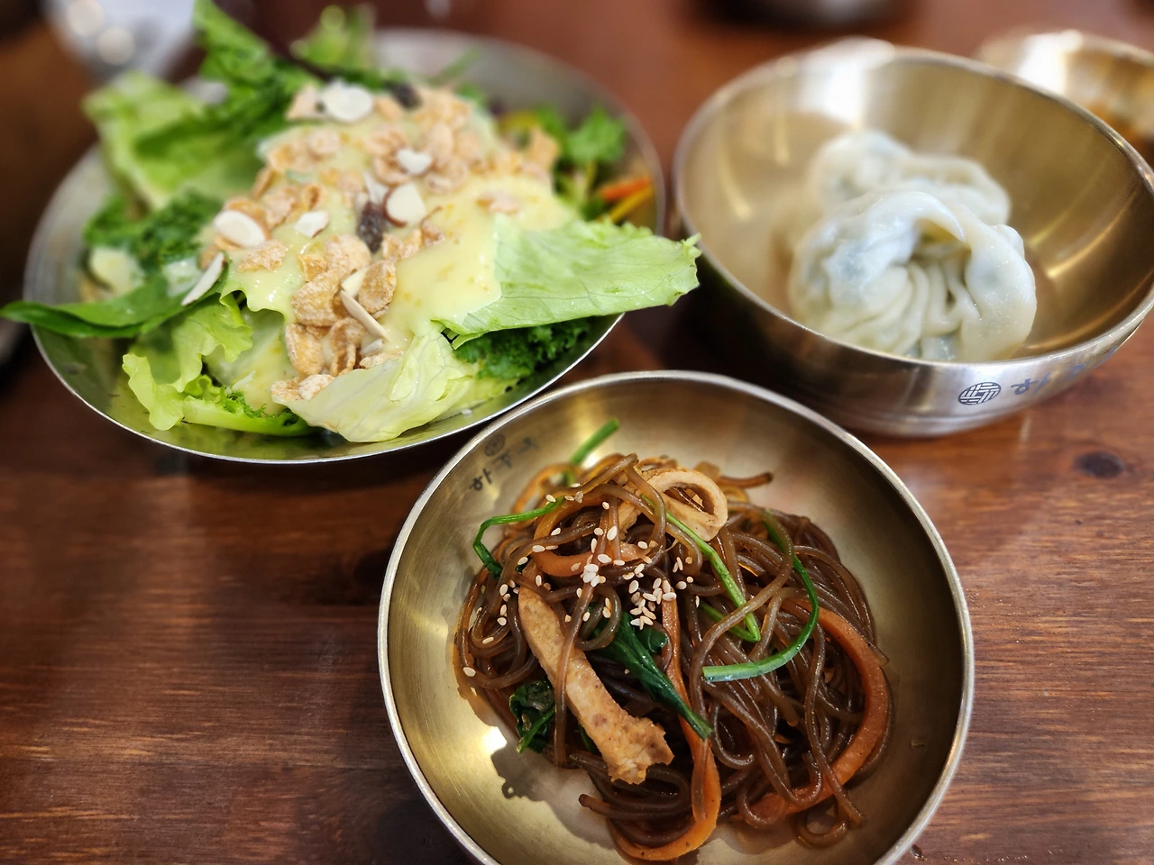 1시간이 지나서 도착한 대기 순번은 그러고서도 앞에 15팀이 남아있었다. 사천 에어쇼 때문에 이 정도의 대기가 아닐까 위안을 하며 번호 호출을 기다렸다. 드디어 순서가 되었고 회비빔냉면과 물비빔냉면을 주문했다. 곧이어 세팅된 샐러드와 왕만두 두 알. 와아! 이게 기본찬이라니. 냉면을 입에 한입 넣고는 길었던 대기 시간은 말끔히 잊혔다.