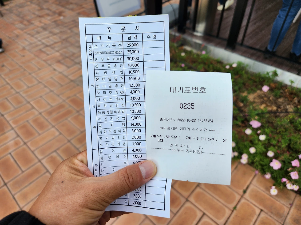 금강산도 식후경! 진주냉면 잘한다는 하주옥에 겨우겨우 도착해서 늘어선 줄에 또 한 번 깜짝 놀랐다. 대기표를 뽑고 지금 부른 번호를 보니 앞 대기팀이 125팀. 하아. 1시간은 족히 기다려야 하는 상황이었다. 그 사이 보기로 한 토지를 향해 달렸다. 삼천포항 바다가 속 시원히 내려다보이는 보물 같은 토지였다.