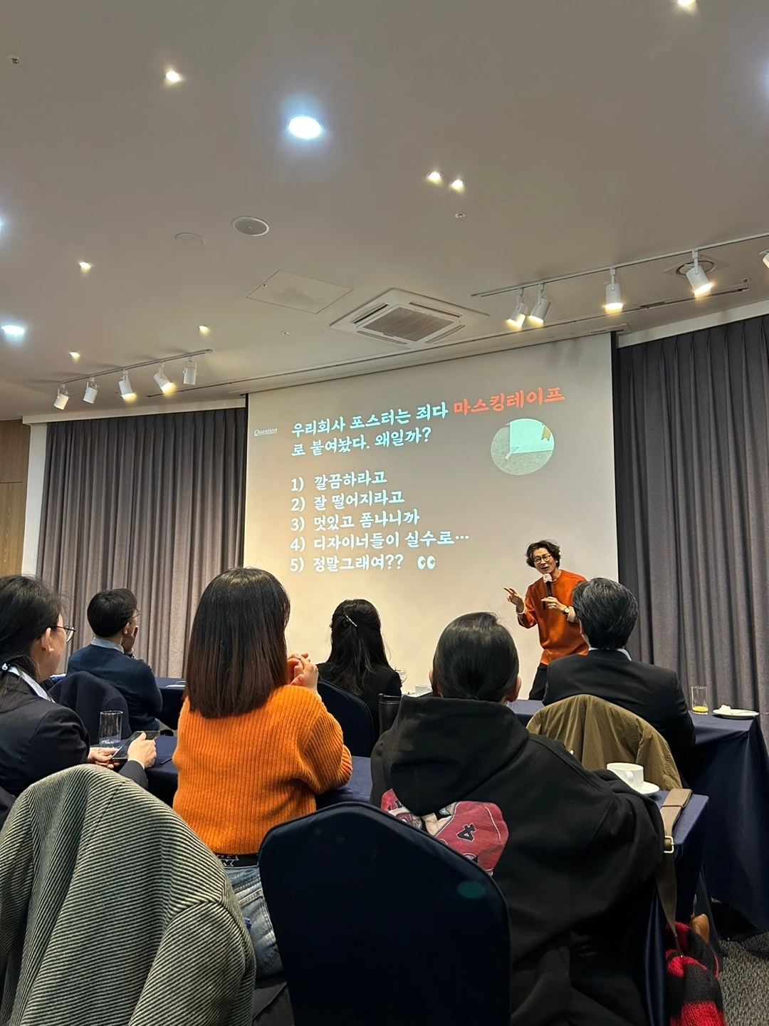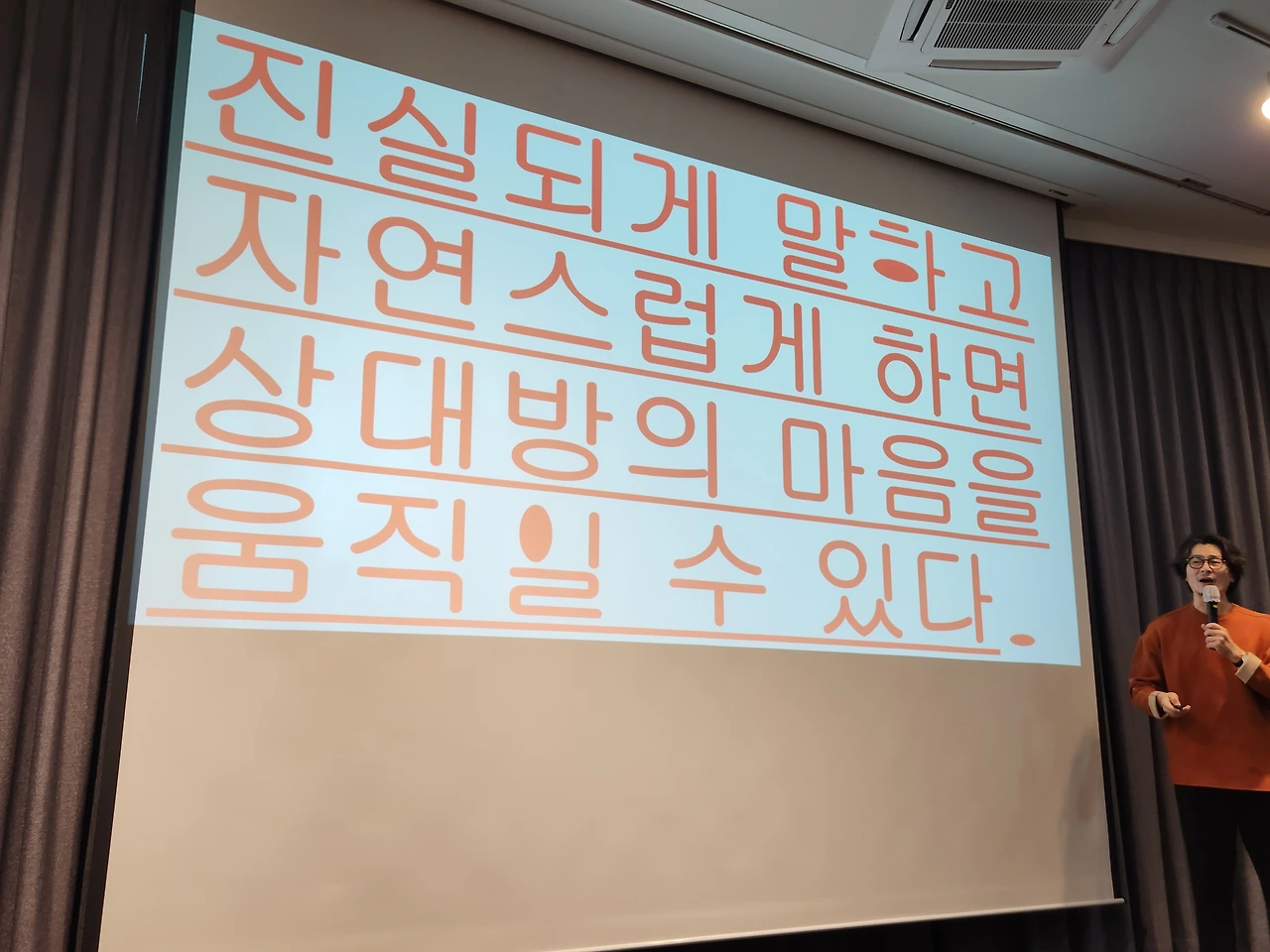마흔 명의 팀마클럽 분들의 한 명 한 명 간단한 소개가 이어졌다. 부산에 이런 다양한 기업, 기관, 언론, 의료, 관광, 호텔, 복지, 영화, 영상, 광고, 마케팅 분야의 인싸들이 계셨나 싶을 만큼 꽉 채워진 기분 좋은 공기에 놀랐다. 여러 챕터들이 하나로 엮어진 다양한 한 권 한 권의 사람 책들이 일어나 자신의 브랜드 컨셉을 짧게 리뷰했다. 그리고 이어진 특강.