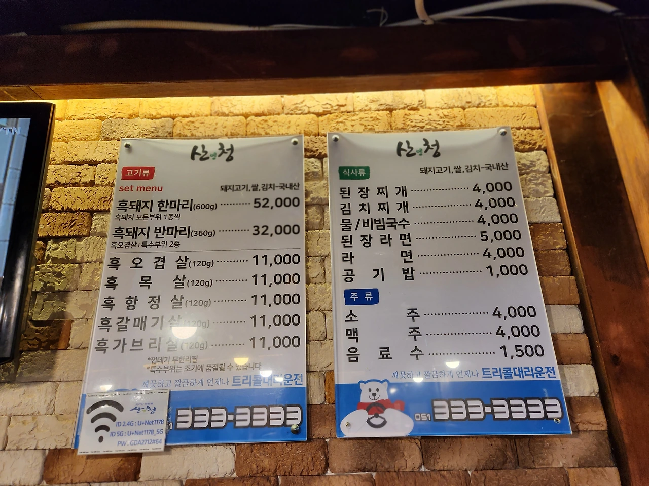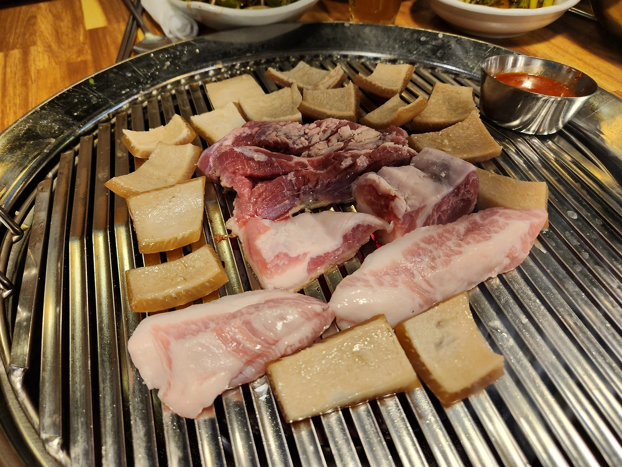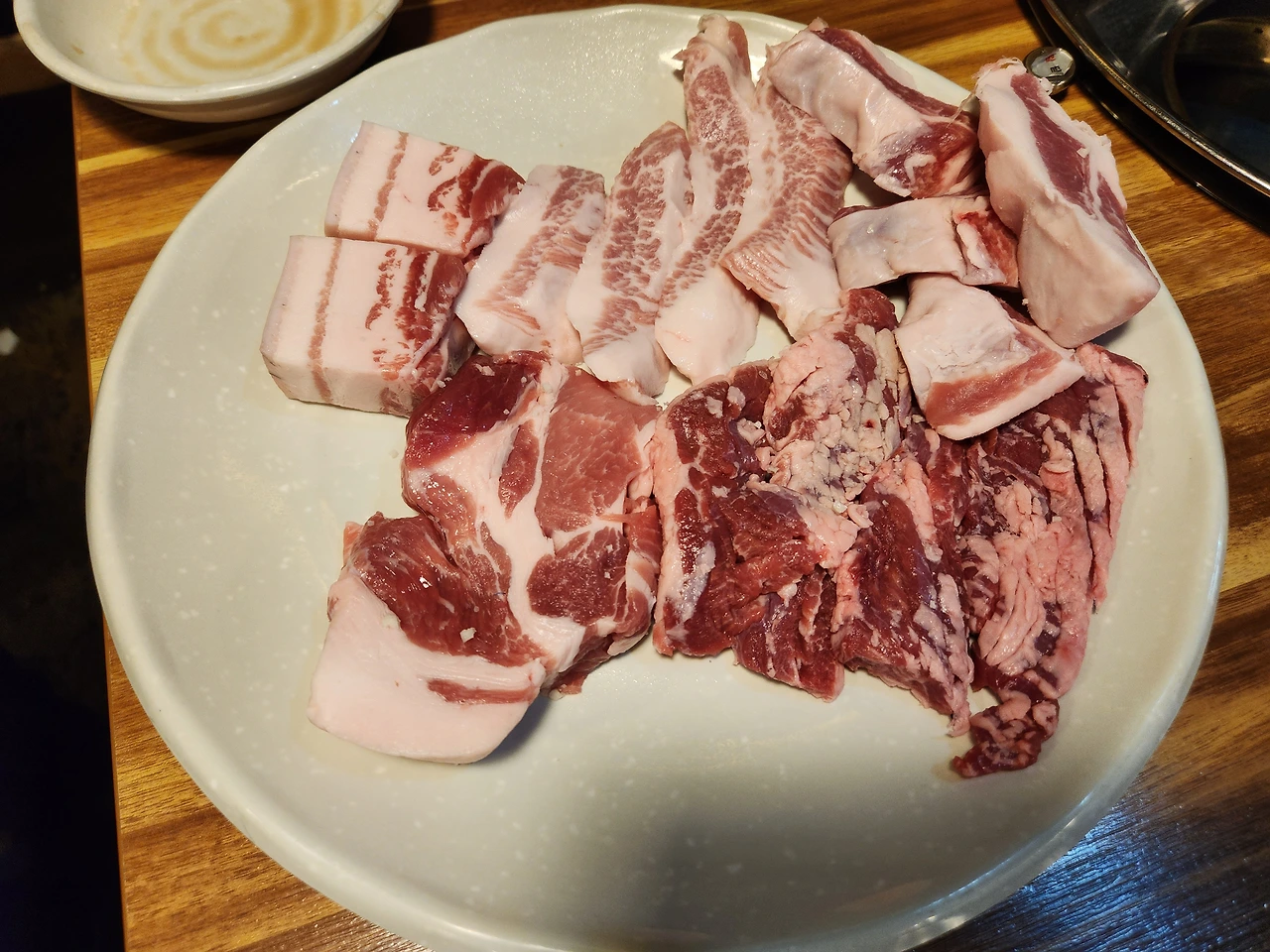 식당 내 부착된 안내판에 새겨진 글이다. 작은아버지 농장에서만 공수된 흑돼지라고 하니 더 신뢰가 간다고 할까? 제주흑돼지에 비해 가성비 있는 가격에 또 한 번 놀랬다. 모든 부위를 믹스한 흑돼지 한 마리 600g이 52,000원. 특수부위를 포함한 120g의 1인분도 크게 부담이 없는 가격이다. 이건 정말 먹어봐야 안다. 밑찬에 함께 나오는 돼지껍데기 맛 또한 일품. 심지어 껍데기는 무한리필.