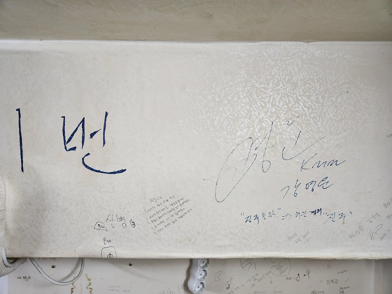 하필 그날 손님이 꽉 찬 날이라 촘촘한 계단을 따라 올라가 머리가 부딪힐 수도 있는 천정이 낮은 2층에 자리했다. 맞은편 분들도 회식인지 모임인지 진주통닭의 추억 가득 연신 술잔을 부딪혔다. 벽지를 비교적 최근에 바꾼 건지 노포의 느낌이 사라졌지만 여전히 낙서를 즐기는 분들의 흔적이 가득했다.