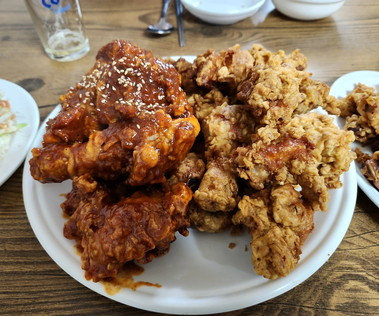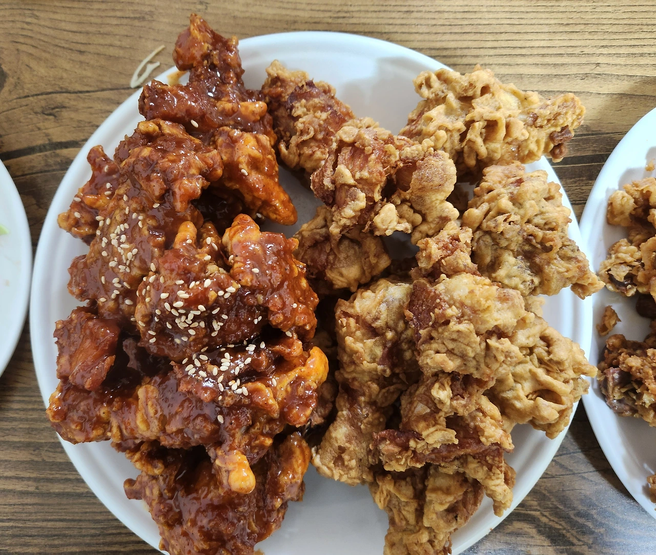 시작은 역시 닭똥집! 사이즈 스케일이 다른 진주통닭의 닭똥집 튀김은 밑찬으로도 조금 나오지만 만 원짜리 하나를 두 테이블에 나눠 담아 달랬더니 2개를 주문한 듯하다. 마치 애피타이저를 즐기듯 닭똥집을 맛있게 먹고 2차로 왔던 우린 후반+양념 小자를 주문했다. 반반은 진리, 국룰이니까.