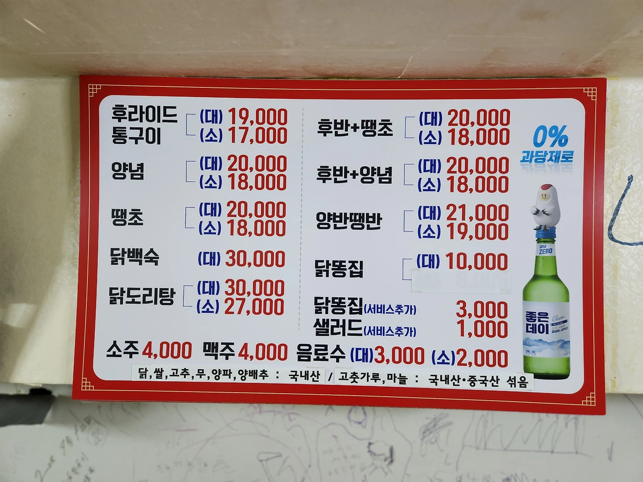 2만 원을 넘는 요즘 후라이드 치킨 값. 진주통닭도 예전에 비해 많이 오른 건 사실이지만 大 19,000원, 小 17,000원만 보면 전혀 감흥이 오지 않는다. 하지만 완성된 치킨이 상에 놓이면 그때서야 와~ 역시라는 함성이 터진다. 후라이드의 느끼함이 싫은 분들이라면 후반+땡초가 특히 인기인 진주통닭.