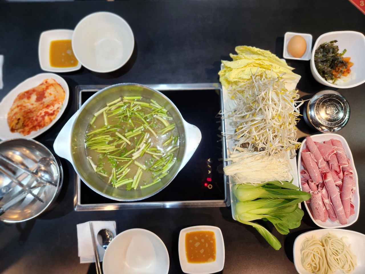 아낌없는 야채와 버섯(느타리와 팽이)을 육수에 투하하고 맛있게 익은 야채를 먹다가 등심을 넣어 익자마자 건져 소스에 찍어 먹으면 그 맛이 일품이다. 이 정도 금액에 고기가 고기서 고기겠다 싶지만 한입 먹으면 부드러운 고기맛에 흠칫 놀라고 만다. 이 집 제대로 하는 집이구나?