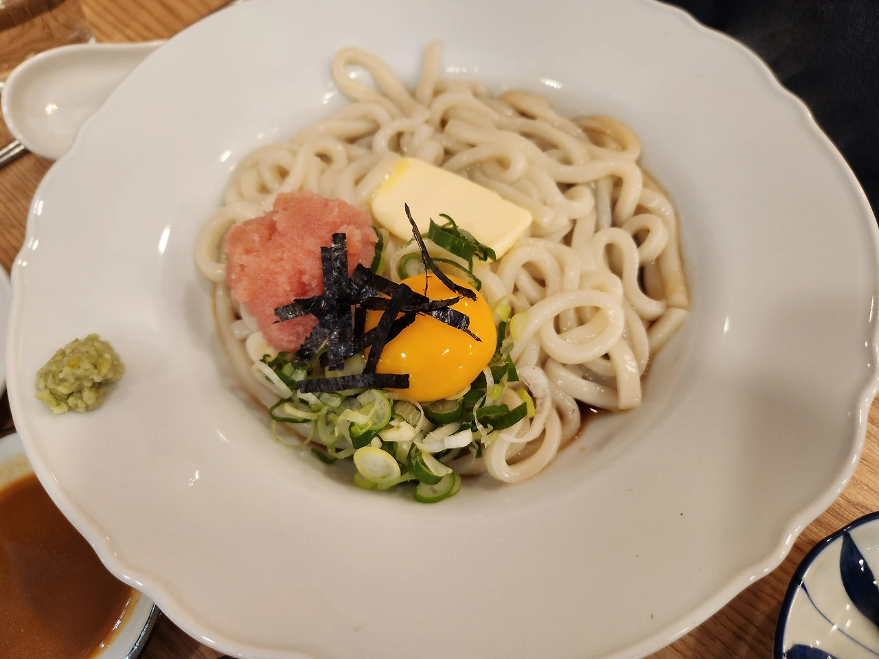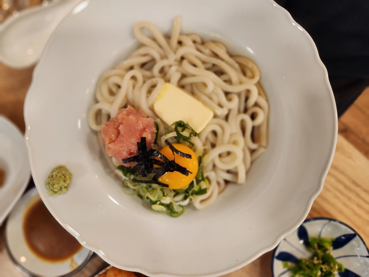 소고기덮밥을 한입 넣으니, 꾸미지 않는 맛, 그대로다. 닭고기계란덮밥 또한 양파와 계란이 소스와 절묘하게 어우러져 닭고기에 영혼을 불어넣은 맛이다. 든든한 한 끼로 손색없다. 명란비빔우동이 테이블에 놓이자 일순 감탄, 명란과 버터, 계란과 김가루가 앉아있고 느끼함을 덜해줄 땡초가 춤을 춘다.