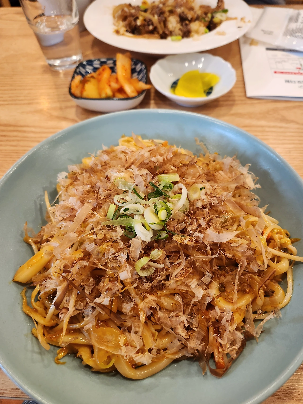 느끼할 줄 알았던 우동이 부드럽게 혀끝을 감싼다. 명란 본연의 맛에 계란의 고소함이 더해져 부드럽게 넘어간다. 볶음우동은 살짝 매울 수 있어 순한 맛, 매운맛을 고를 수 있다. 당연히 순한 맛으로. 면과 숙주, 양배추가 소스에 버무러져 볶아져 있고 그 위를 장식은 가쓰오부시가 하늘하늘 춤을 춘다.