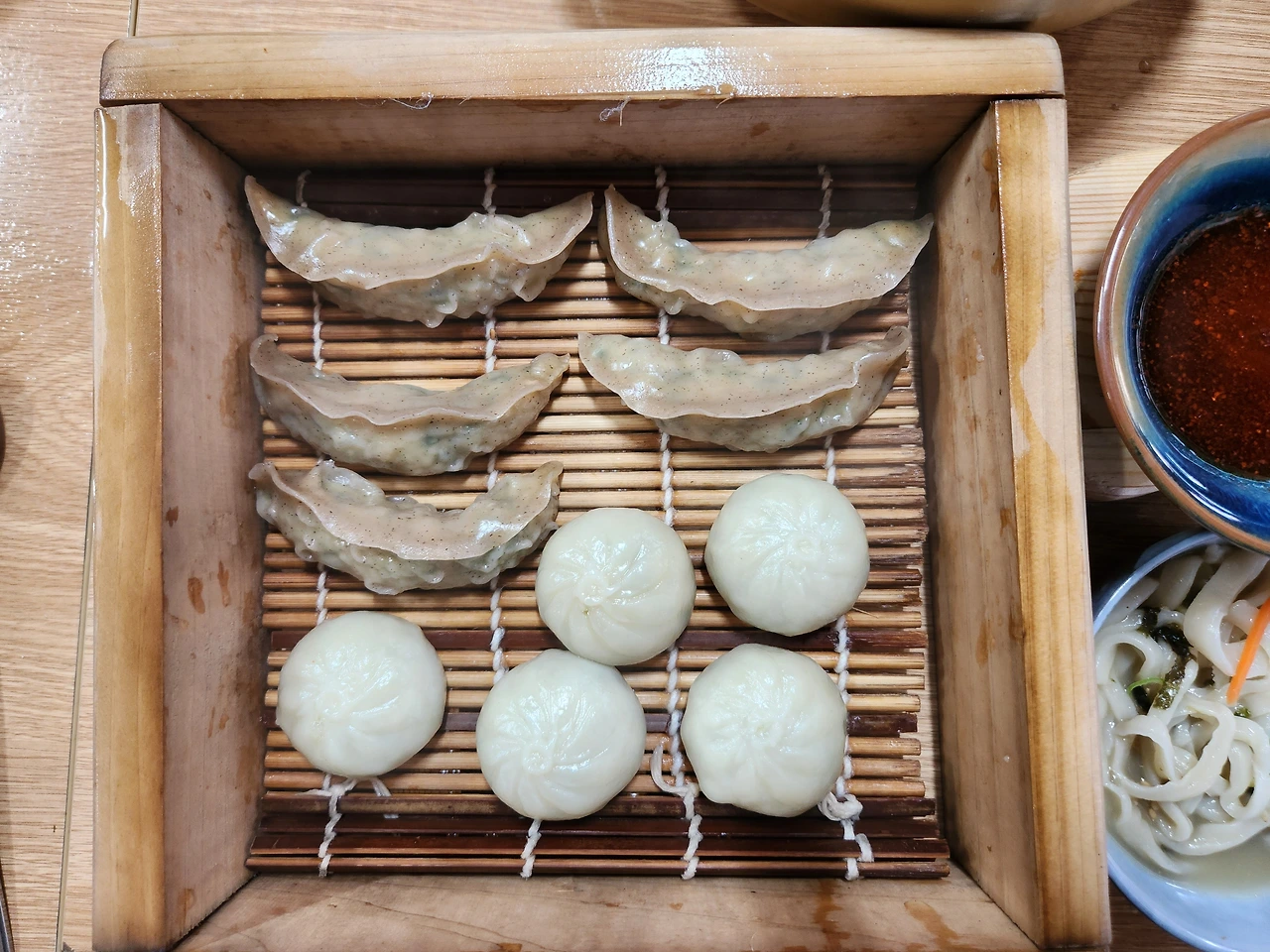 칼국수 좋아하지 않는 아이를 위해 상황꼬물이만두라면을 주문했다. 한눈에 확 매울거 같은데 한입 먹어본 아이가 잘도 먹는다. 만두에 떡에 콩나물에 고추기름 둥둥 떠있는 한눈에 보기에도 맛있어 보이는 라면이 별미였다. 감자만두와 메밀만두를 함께 맛볼 수 있는 모듬만두 역시 젖가락을 바삐 움직이게 하는 사이드 별미였다.