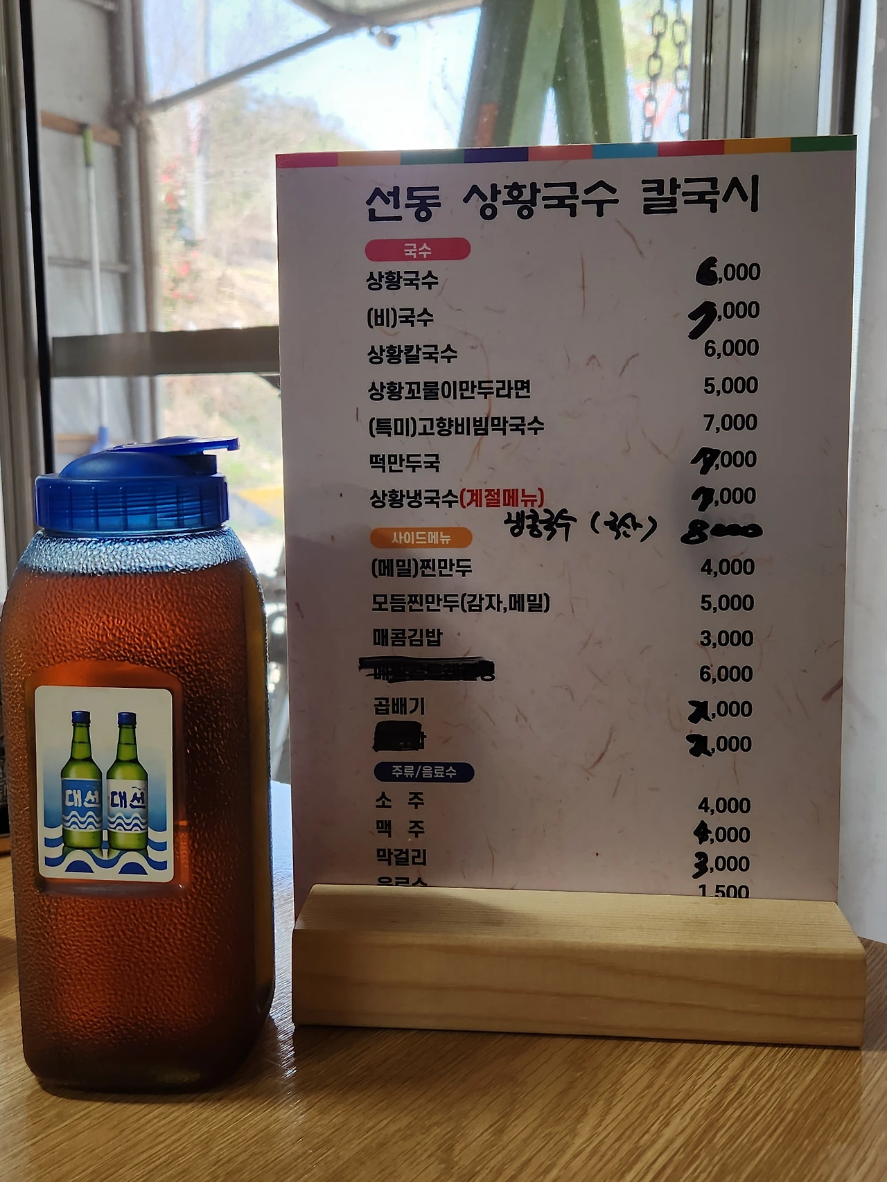 상황국수 6천 원(비빔 7천 원), 상황칼국수 6천 원, 고향비빔막국수 7천 원 등 메뉴판에 네임펜으로 덧입혀진 가격표를 감안하면 이것도 최근에 오른 가격이라는 것. 결국 상황버섯물로 만든 칼국수가 6천 원이란 건데 시중 칼국수 가격을 생각하면 비슷하다고 생각할 수 있다.