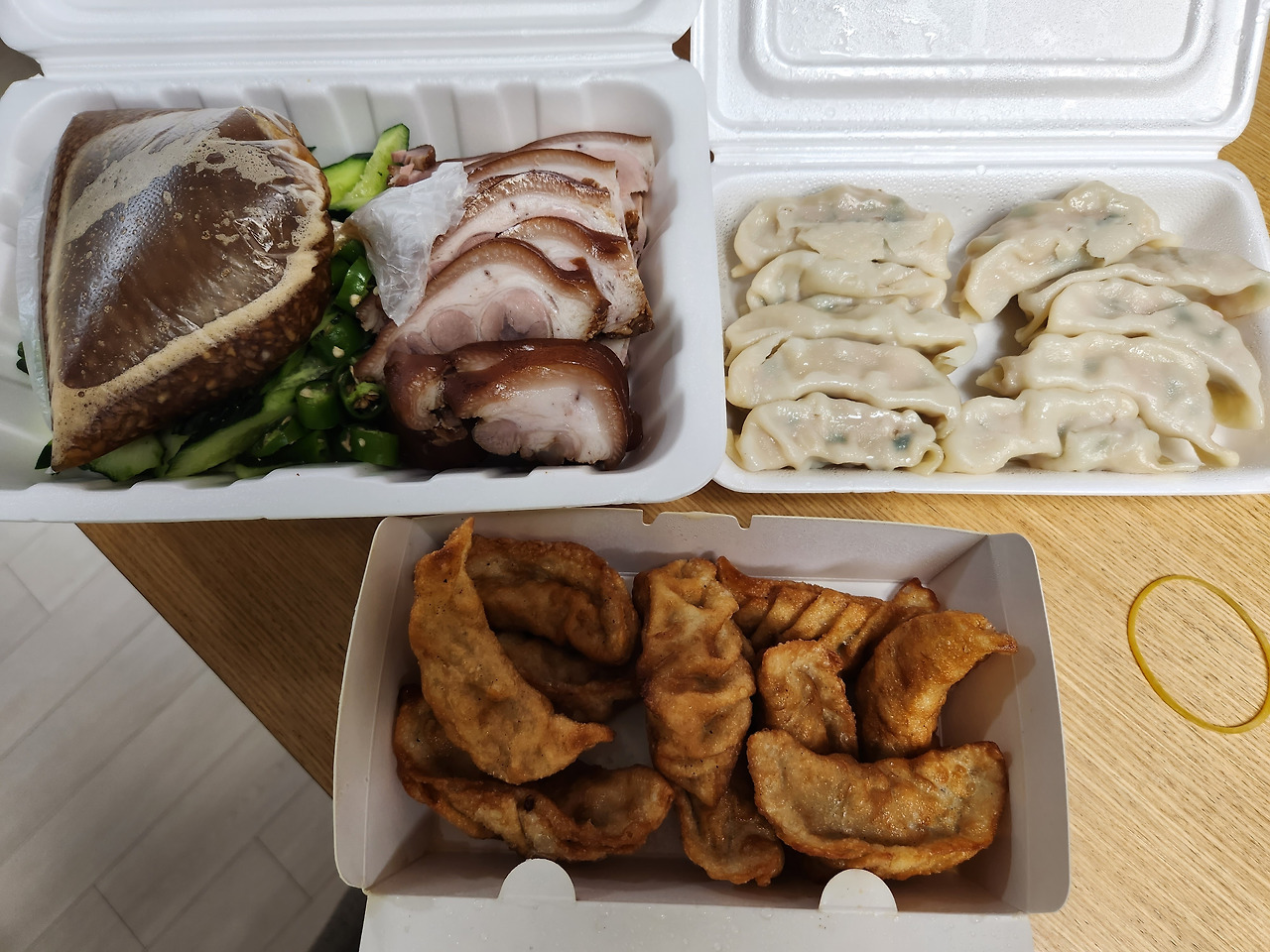만두국밥이 너무가 궁금했으나 포장해 가야 하는 나로선 고심 끝에 찐만두와 군만두, 오향장육을 주문했다. 만두국밥으로 혼밥 하는 분들이 많아서 깜짝 놀라는 밤이다. 따끈한 한 그릇이면 허기가 싹 날아갈 듯 김이 모락모락 올라왔다. 생각보다 오래 걸리지 않았고 포장된 음식을 받아 들고 역시 집으로 냅다 달렸다.