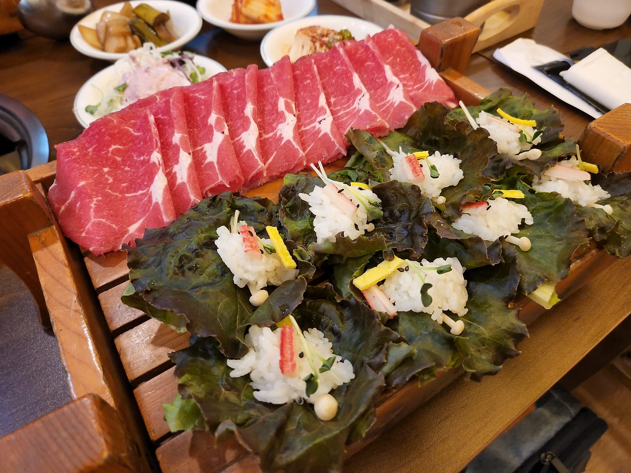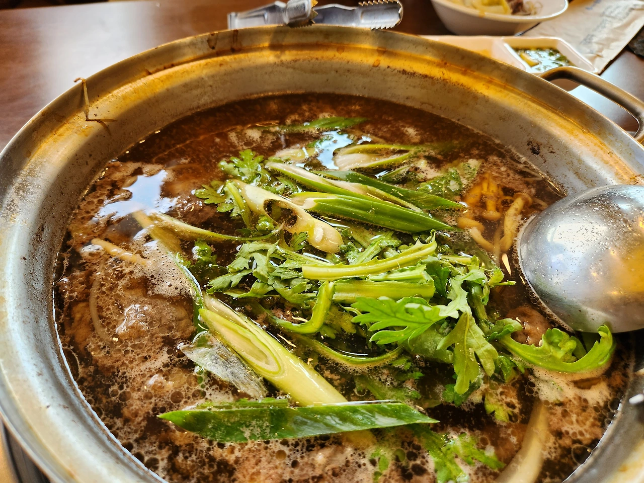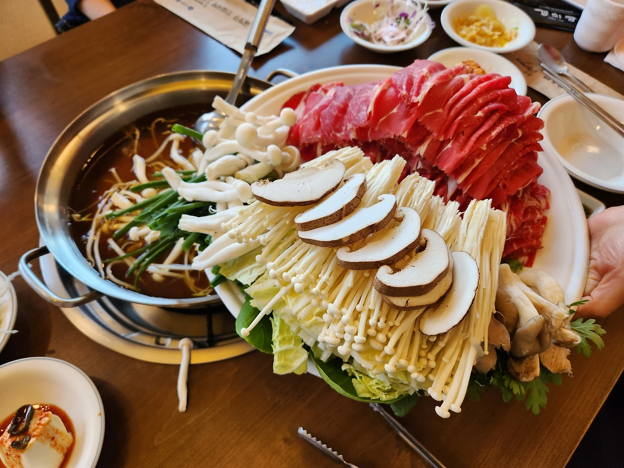 작년 저녁에 약속이 있어 들렀던 그곳엔 쇠고기에 해물, 버섯과 갖은 야채가 한가득, 테이블이 가득 찼던 기억이다. 육수에 버섯과 야채를 넣고 끓이다 쇠고기와 해물을 토렴해 먹고 난 후 상추쌈에 하나씩 고기를 얹어 먹는 새로움이란. 그리고는 쑥국수를 마무리로 배를 가득 채웠다.