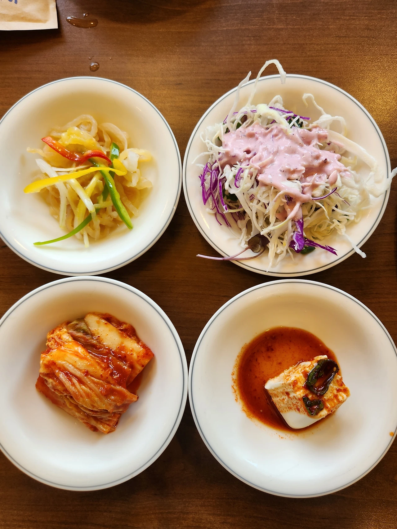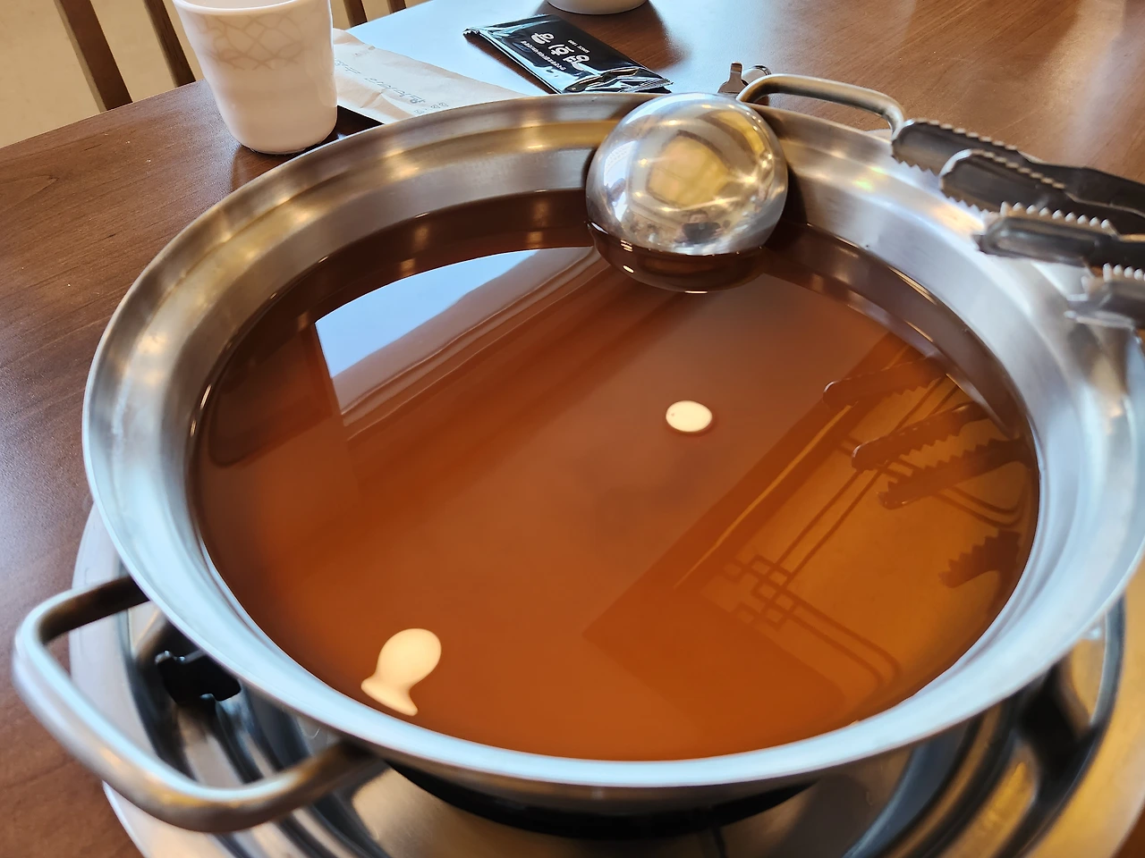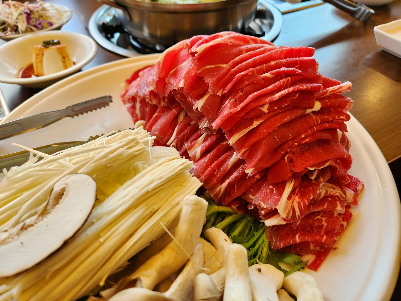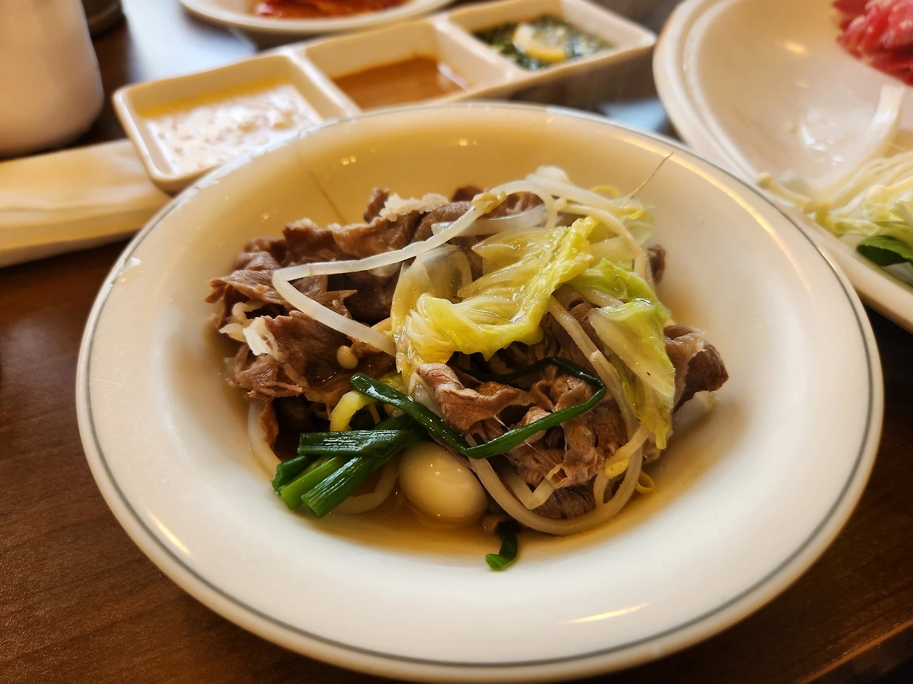 정갈한 찬이 세팅되고 접시를 둥그렇게 가득 채운 야채와 버섯, 그리고 쇠고기가 담아져 나온다. 육수의 빛깔은 여전히 심상치 않고 30년이란 세월이 무색하지 않은 노하우가 켜켜이 쌓인 듯하다. 버섯과 야채를 넣어 끓이다 쇠고기를 조금씩 넣어 먹기 시작했다. 3가지 소스는 역시나 골라먹는 즐거움이다.