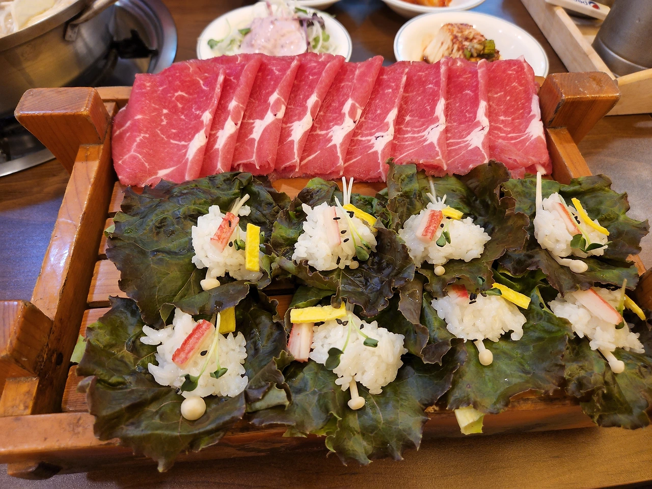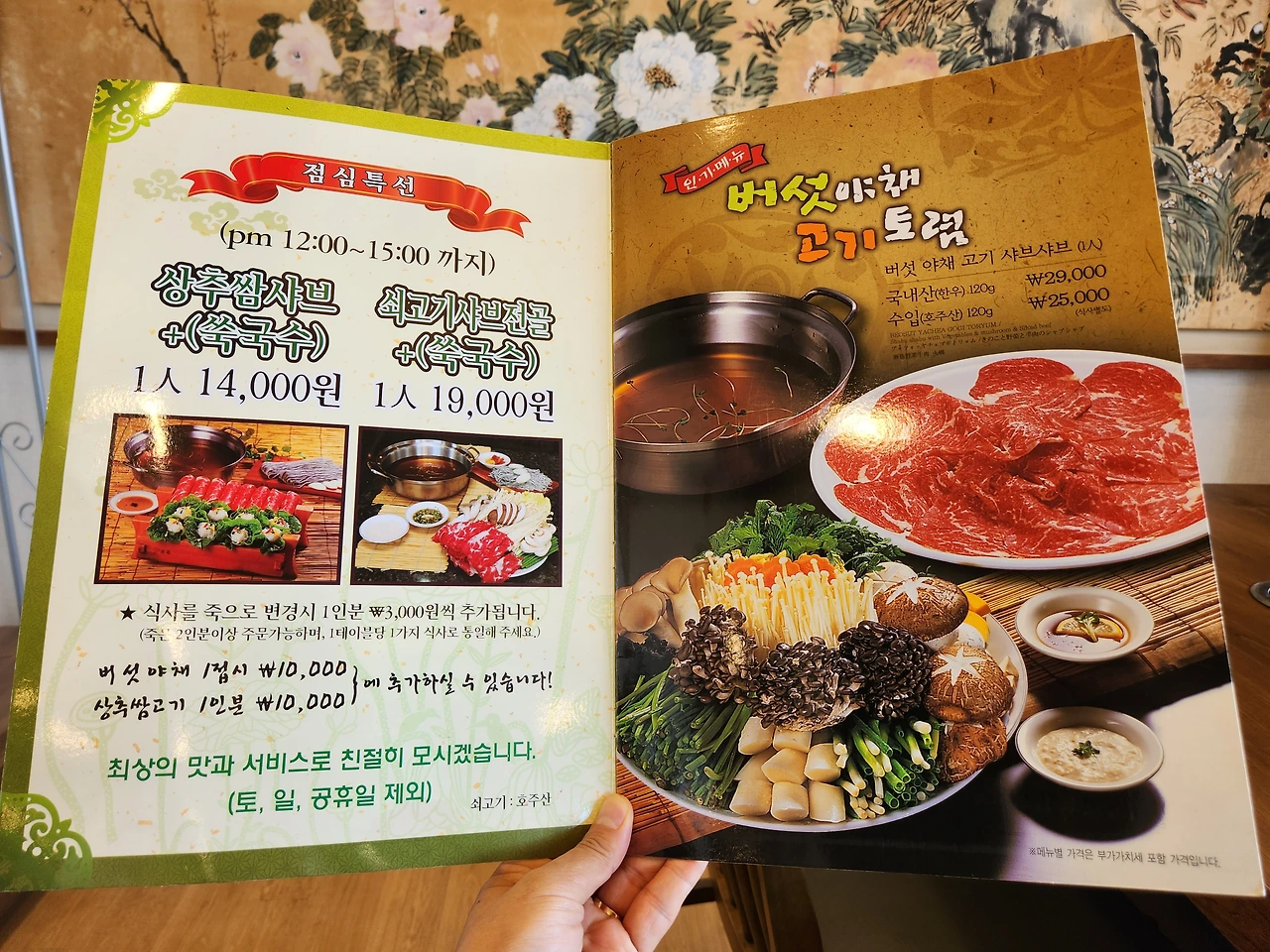 그리고 두 번째 방문은 점심이었다. 정오 12시부터 오후 3시까지 가능한 점심 특선은 상추쌈샤브와 쑥국수 14,000원, 쇠고기 샤브전골과 쑥국수 19,000원의 두 가지로 구성되어 있었다. 너무 이쁜 상추쌈이지만 버섯, 야채 등 추가 주문을 하지 않기 위해 샤브전골로 주문했다.