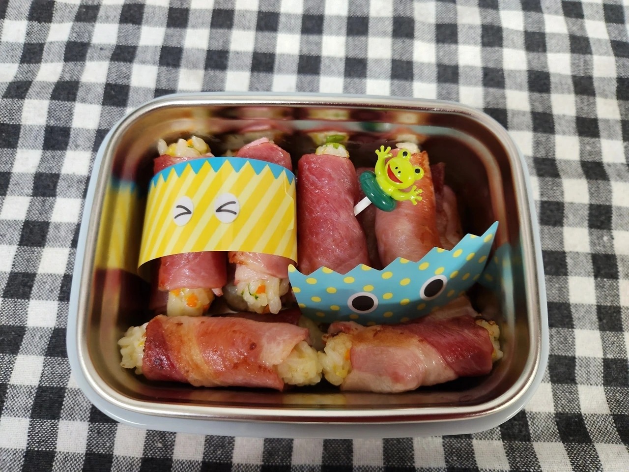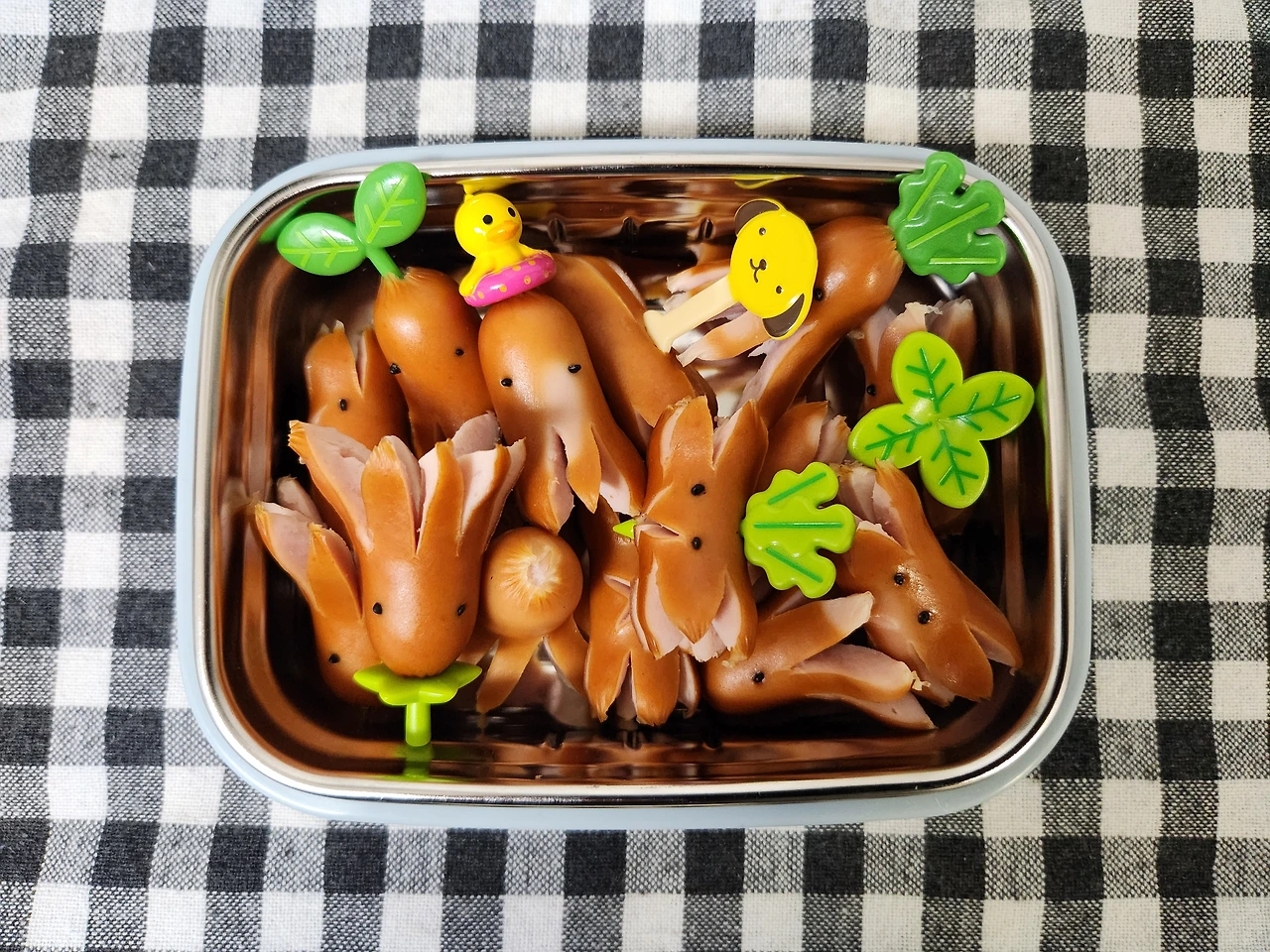 아침 일찍 일어나 밥을 짓고 먼저 미니 햄버거를 만들었다. 오렌지와 키위를 깎아 과일 도시락을 만들고 과자를 골고루 넣어 과자 도시락도 만들었다. 햄버거로는 배가 안 찰 거 같아 베이컨 말이도 준비했다. 야채와 소고기를 넣어 볶은밥에 베이컨을 돌돌 말아 구운 밥. 그리고 빠져선 안 되는 비엔나 소시지! 문어와 게 모양으로 까만 깨도 잊지 않았다. 그렇게 총 5개의 도시락이 차려졌다.