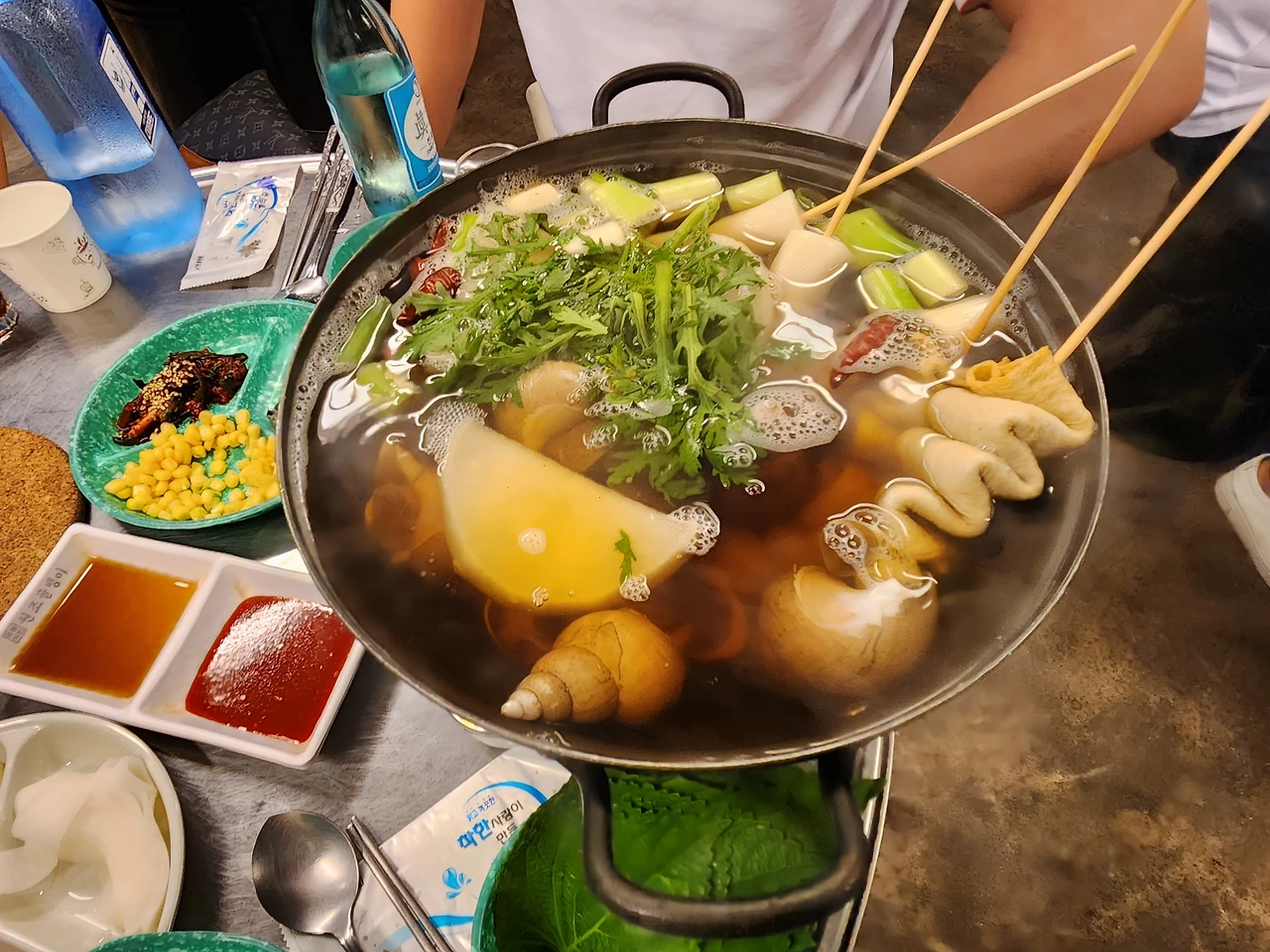 중자 36,000원, 대자 58,000원, 다소 비싸다고 생각할 텐데 당일 나온 백골뱅이를 그것도 동해의 자연산 생물 가득 담긴 탕을 보게 되면 다소 마음이 놓인다. 비싼 데는 비싼 이유가 있구나 싶어. 백골뱅이의 맛을 그대로 살리기 위해 야채로만 채워졌다. 어묵꼬치와 물떡꼬치는 신의 한 수. 부드럽고도 야들야들하다. 백골뱅이를 꺼내 전용 포크로 찍어 세상 밖으로 골뱅이를 탈출시켜 입에 넣으니 그야말로 꿀맛이다. (골뱅이 좋아하지 않는 사람은 도전하지 말 것. 하지만 먹어봤던 일반 통조림 골뱅이 맛과는 비교할 수 없음을 상기할 것)
