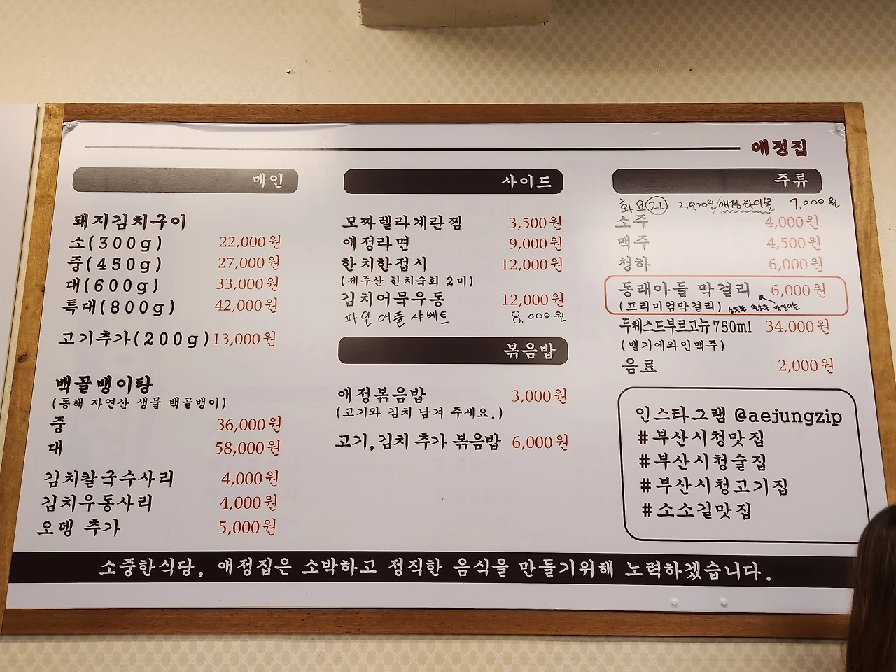 늘 먹는 중식, 돼지고기, 소고기, 회, 치킨, 꼬치구이가 아닌 색다른 메뉴의 포차 분위기 맛집이 필요하다면 주저 없이 애정집을 추천한다. 동그란 테이블에 살아가는 이야기를 안주 삼아 소주를 곁들이는 시간, 캬! 이게 사람 사는 맛 아니겠는가. 네! 부산에서도 동해 자연산 백골뱅이탕, 애정집에서 먹을 수 있습니데이~